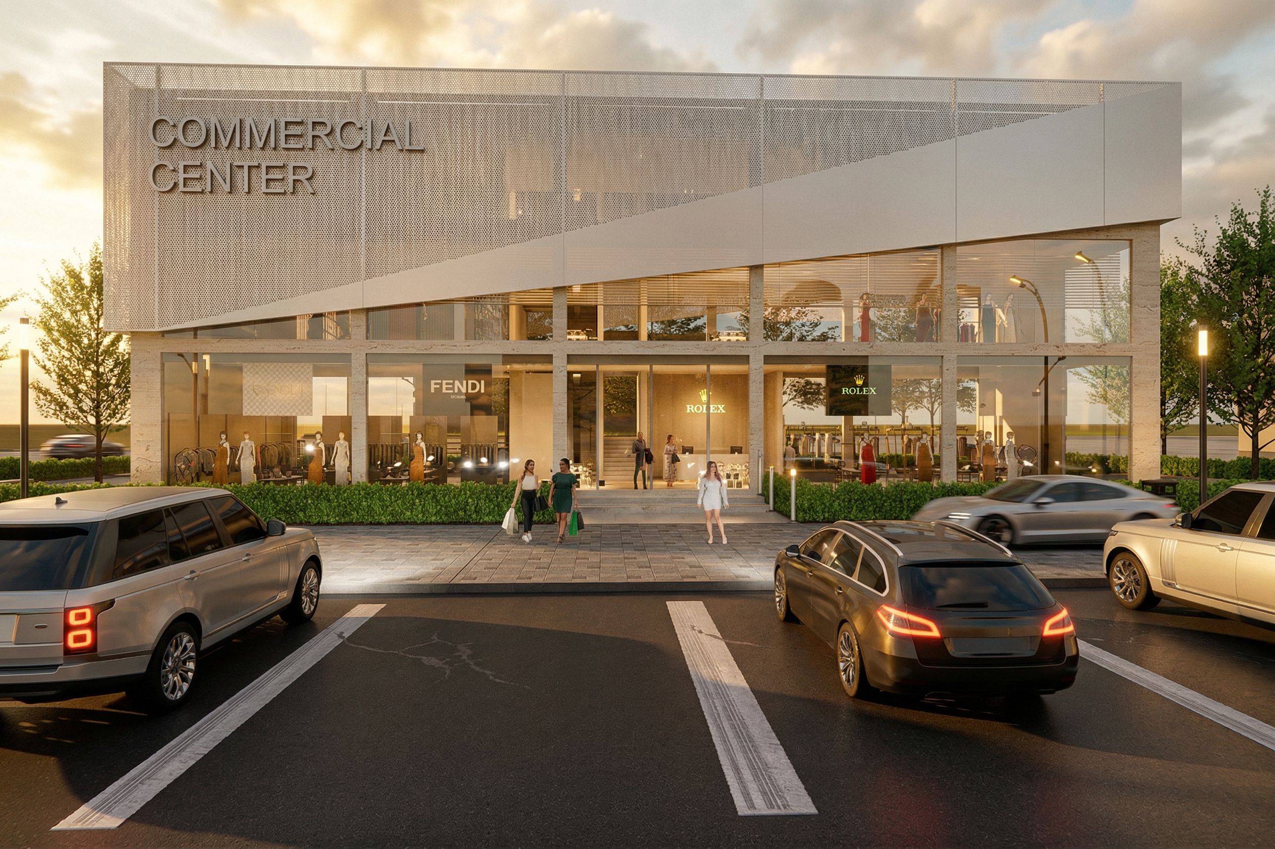 PromptTransform this architectural image into an ultra-photorealistic render while strictly preserving the original building design, geometry, proportions, and all architectural details. Do NOT change the building in any way. Apply a high-end commercial visualization style with the following characteristics: Lighting & Atmosphere: • warm golden hour sunlight (sunset lighting) • soft long shadows with cinematic depth • slightly dramatic sky with soft clouds • realistic global illumination and natural light bounce Materials (very important): • light beige travertine stone with subtle imperfections and natural texture • smooth white facade panels with soft shading • large transparent glass storefront with realistic reflections and interior visibility • highly detailed reflections on glass and السيارات Environment & Realism: • luxury retail stores inside with warm ambient lighting • people walking naturally near the entrance • modern cars parked and passing by with realistic reflections • detailed pavement (stone or concrete) slightly reflective • urban street elements: trees, street lights, sidewalks Rendering Style: • ultra realistic, 8K resolution • cinematic composition and depth of field • V-Ray / Corona render quality • realistic contrast, exposure, and color grading Keep the camera angle and composition from the input image, but enhance everything to a premium architectural visualization level., keep exact camera angle