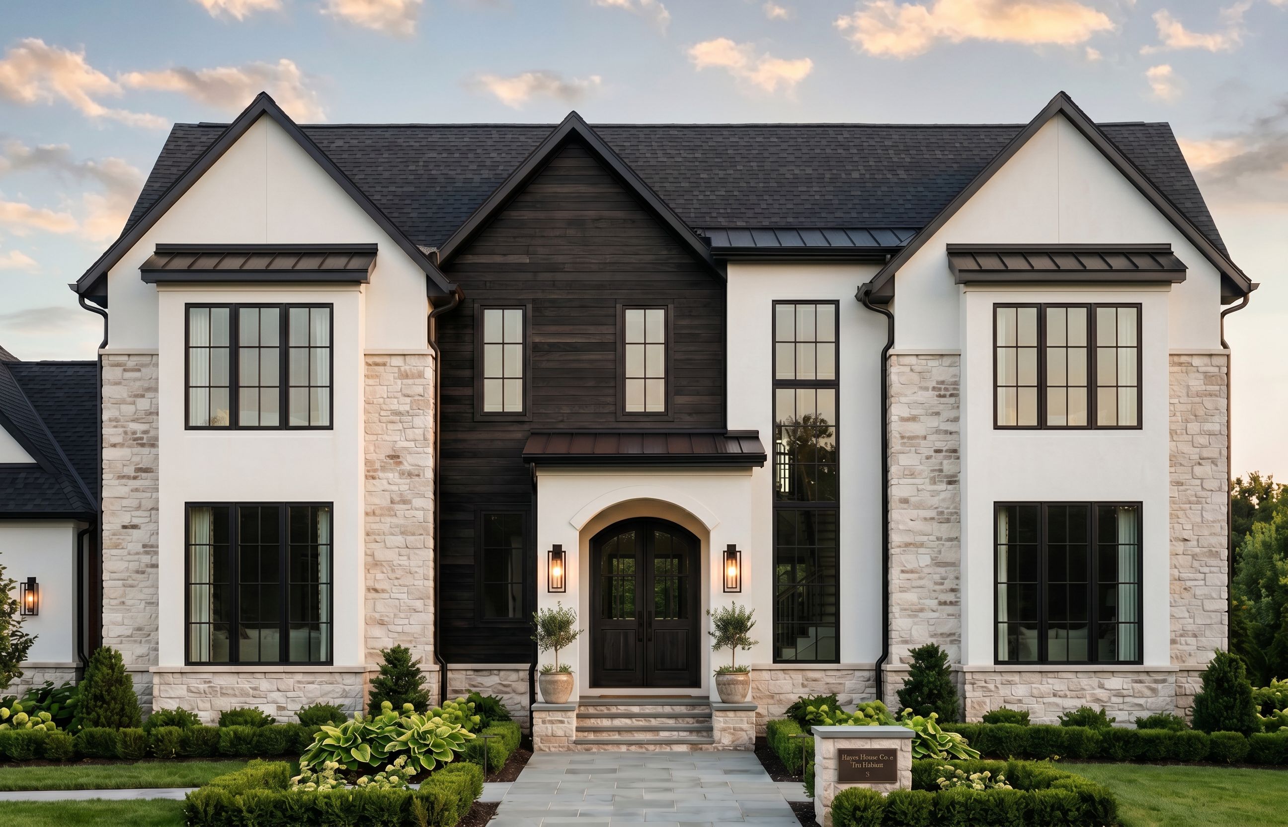 PromptChange the wood siding and front door to black , keep exact camera angle