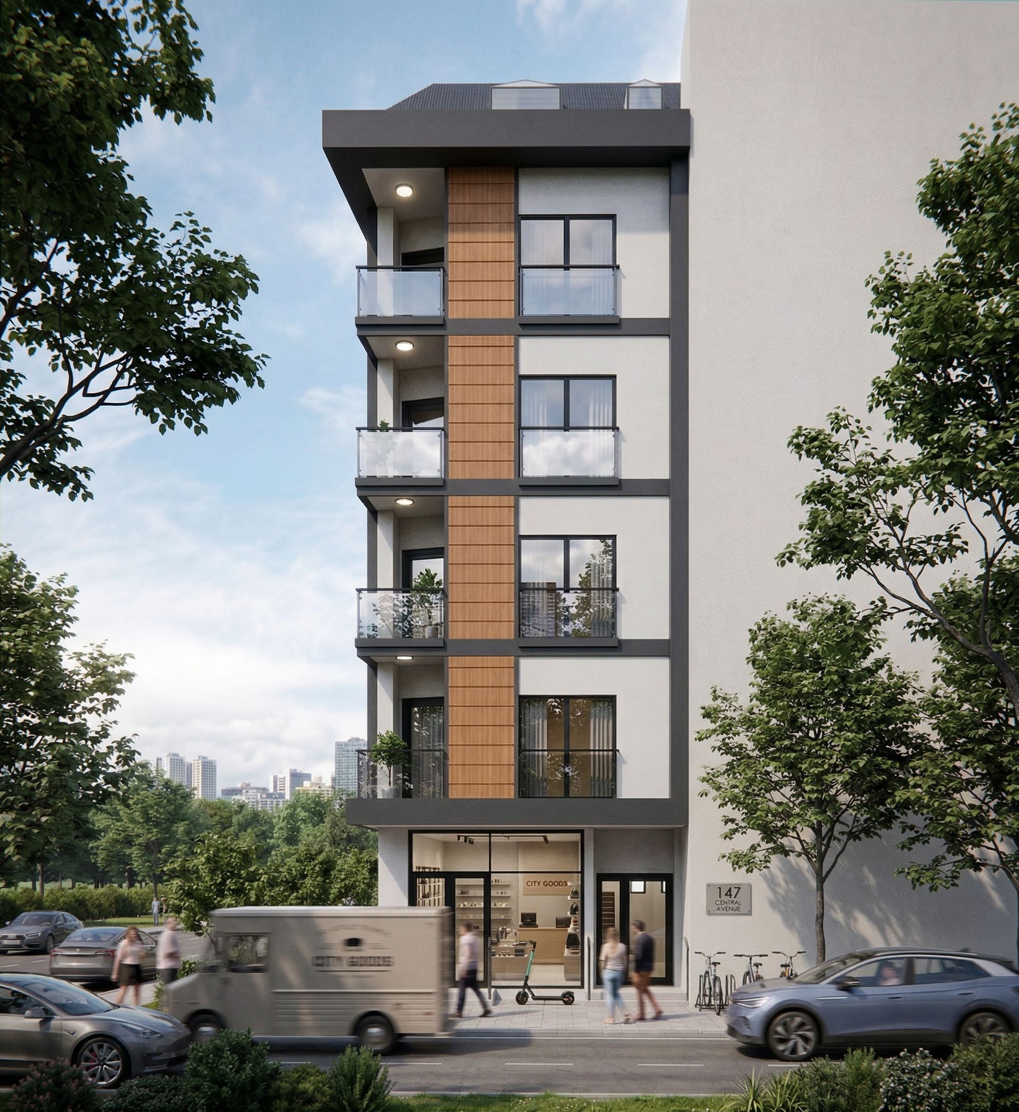 Promptmake the horizontal and vertical gray materials in the building dark gray, keep exact camera angle