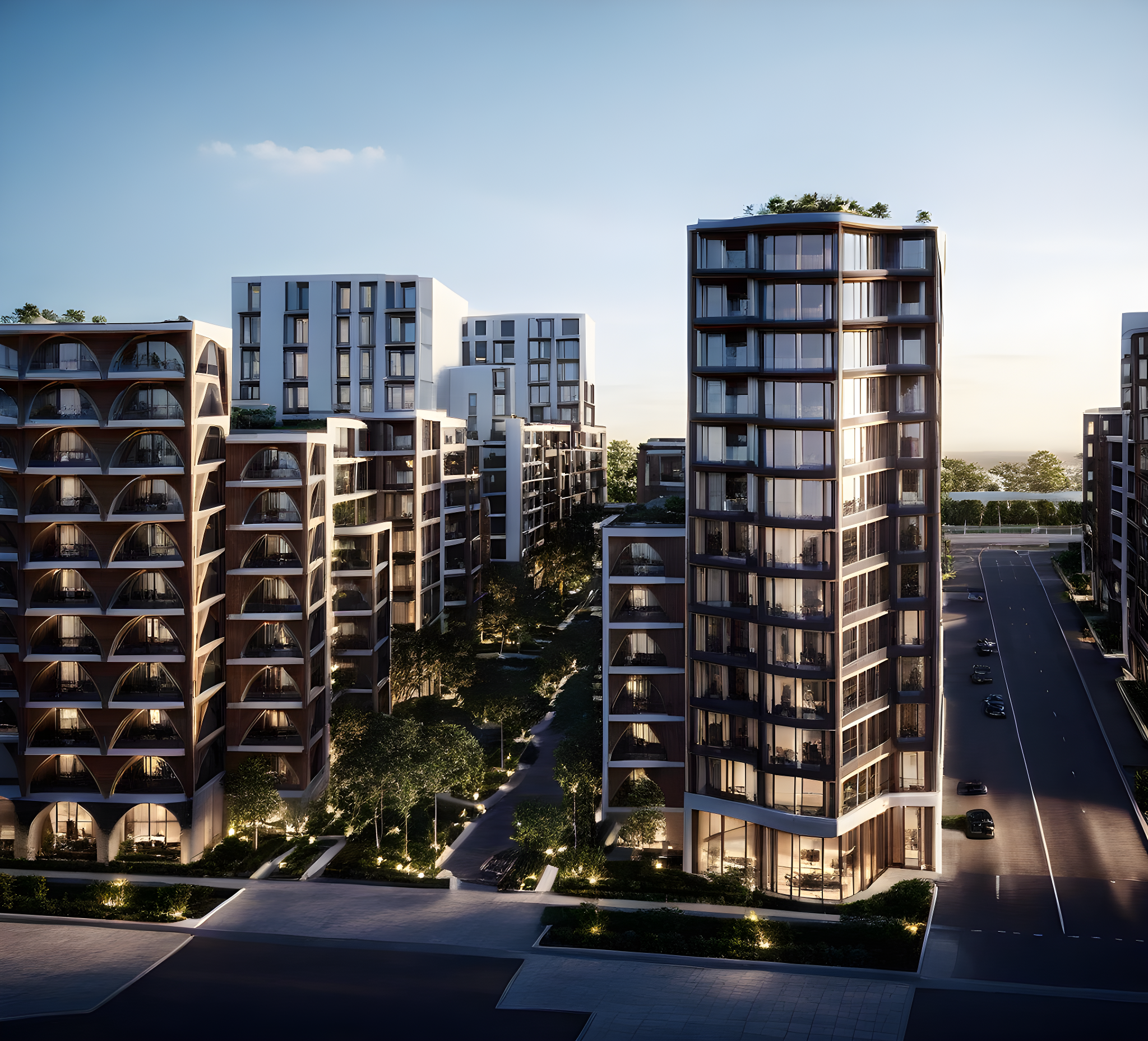 PromptLUXURY ARCHITECTURE. LUXURY APARTMENTS, DAY LIGHT, AVENUE, DAY LIGHT