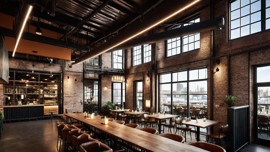 PromptIndustrial-style restaurant featuring a bright and vibrant atmosphere, with an urban view visible through the windows.