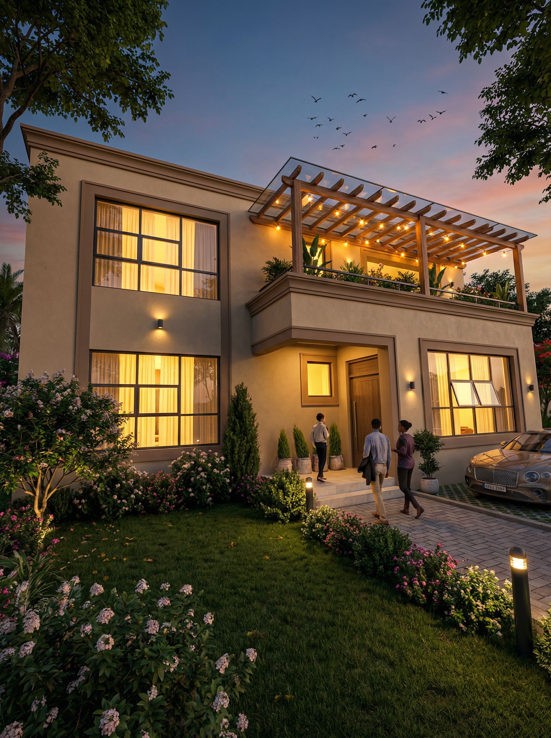 architectural exterior rendering, render this photo into photorealistic rendering, Warm summer evening sky with birds in the sky. Turn on the lights in the building. Use shades of naive in the building with the Mosul dings slightly darker. Include a glass covered wooden pergolas to cover upper balcony. Include some landscaping., keep exact camera angle, dusk atmosphere with soft lighting, including people, vehicles, greenery and vegetation, trees, street furniture, high quality, professional, detailed scene
