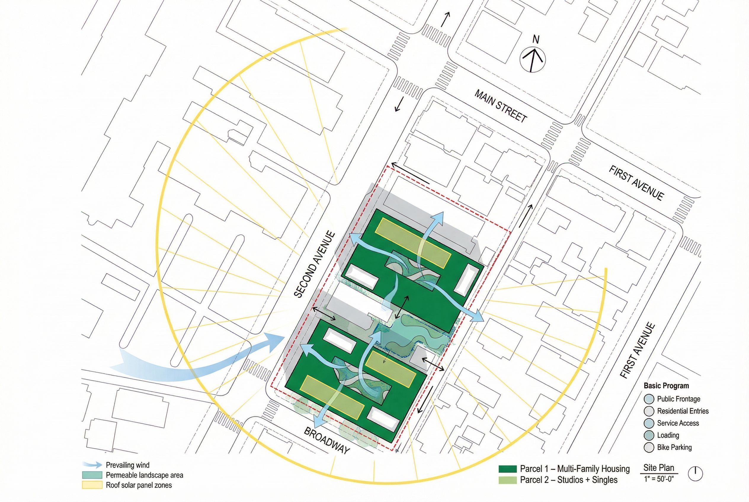 Promptarchitectural floor plan, render this drawing into artistic illustration, “Create a high-resolution architectural site plan using the exact geometry of my provided drawing. Maintain the same clean black-and-white linework for all buildings and context, and keep the two project buildings exactly as modeled — same massing, courtyard shapes, scale, and orientation. No changes to the site geometry. Add full site + road context: Clearly show surrounding streets, sidewalks, crosswalks, and alleys in thin black linework. Label major streets, intersections, and directions (N, S, E, W). Include parcel lines and setbacks subtly. Add outline footprints of adjacent buildings, exactly matching the provided context. Environmental + climate overlay (subtle, diagrammatic): Solar path from the south (yellow curved arc). Summer + winter sun angles with thin radiating yellow lines. Prevailing wind direction from the southwest (soft blue arrows). Ventilation paths through both courtyards (light blue airflow arrows). Shaded zones on the north façades and under overhangs (light grey wash). Permeable landscape in courtyards highlighted in green-blue tones. Roof solar panel zones indicated with transparent yellow rectangles (no change to geometry). Site information to include: Street names labeled in clean architectural text. North arrow. Scale bar. Building labels: “Parcel 1 – Multi-Family Housing” and “Parcel 2 – Studios + Singles.” Basic program bubbles (optional subtle): public frontage, residential entries, service access, loading, bike parking. Pedestrian circulation arrows (thin black). Fire access lane around parcels (dashed red outline, subtle). Stylistic requirements (match the style of your other images): Minimal white background. Thin consistent lineweights like an architectural drawing. No shadows, no textures, no artistic rendering. Only use subtle color accents for environmental data. Keep roads, sidewalks, and buildings sharp, clean, and readable. Keep aerial top-down orthographic view exactly like original site plan. Final output should look like a professional site strategy diagram that integrates context, circulation, and climate analysis while remaining crisp, minimal, and consistent with all previous drawings.”, keep exact camera angle, including people, vehicles, greenery and vegetation, trees, street furniture, high quality, professional, detailed scene