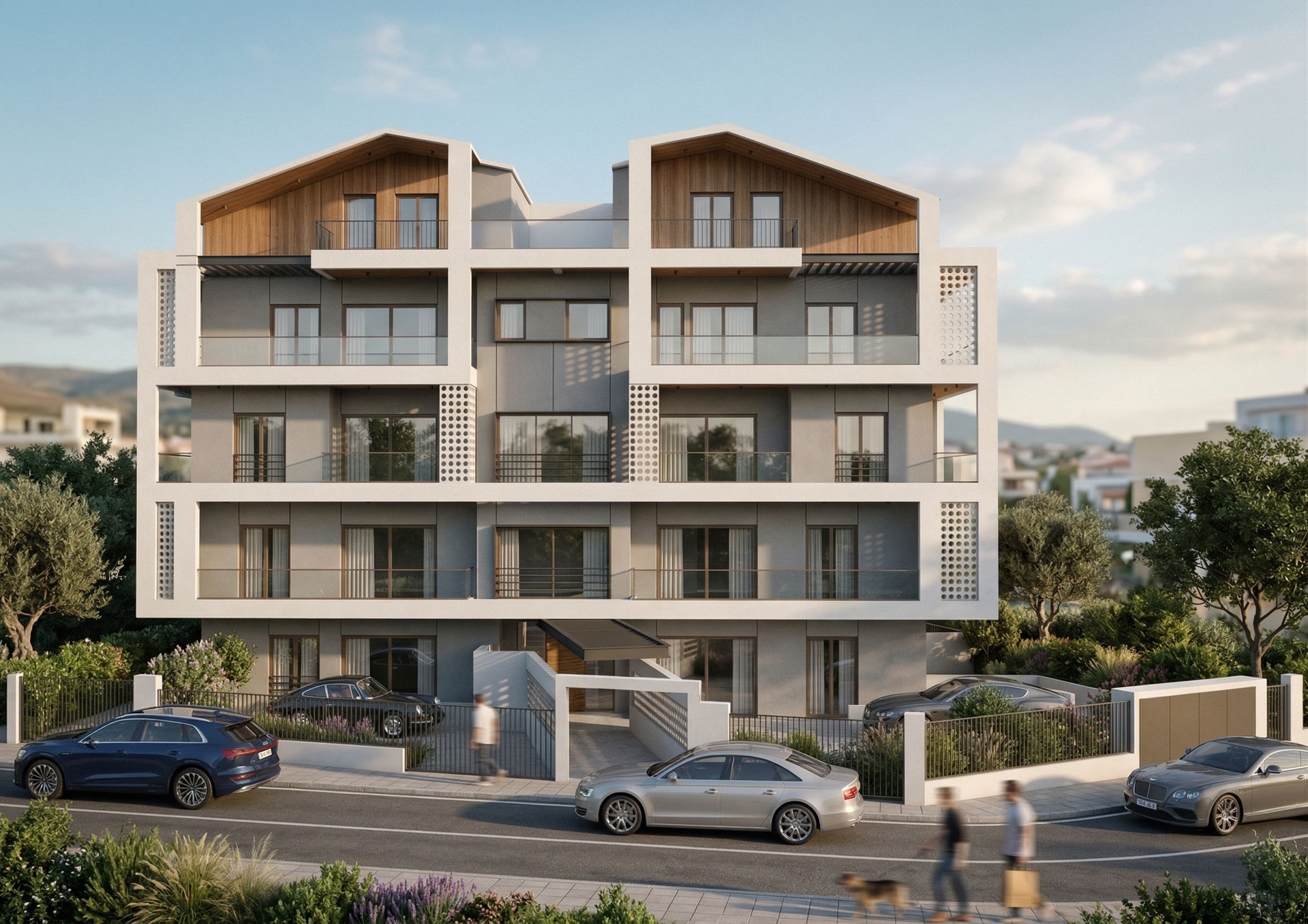 PromptModern block with large windows, materials such as concrete,plaster,metal,wood, clauster surrounded with greenery. Put at the left side in front of the left window a car . Also put at the left side of the building a car. Put at the right side in front of the big window a car and add besides this car a few bushes. Put in front of our building a road with a car., keep exact camera angle