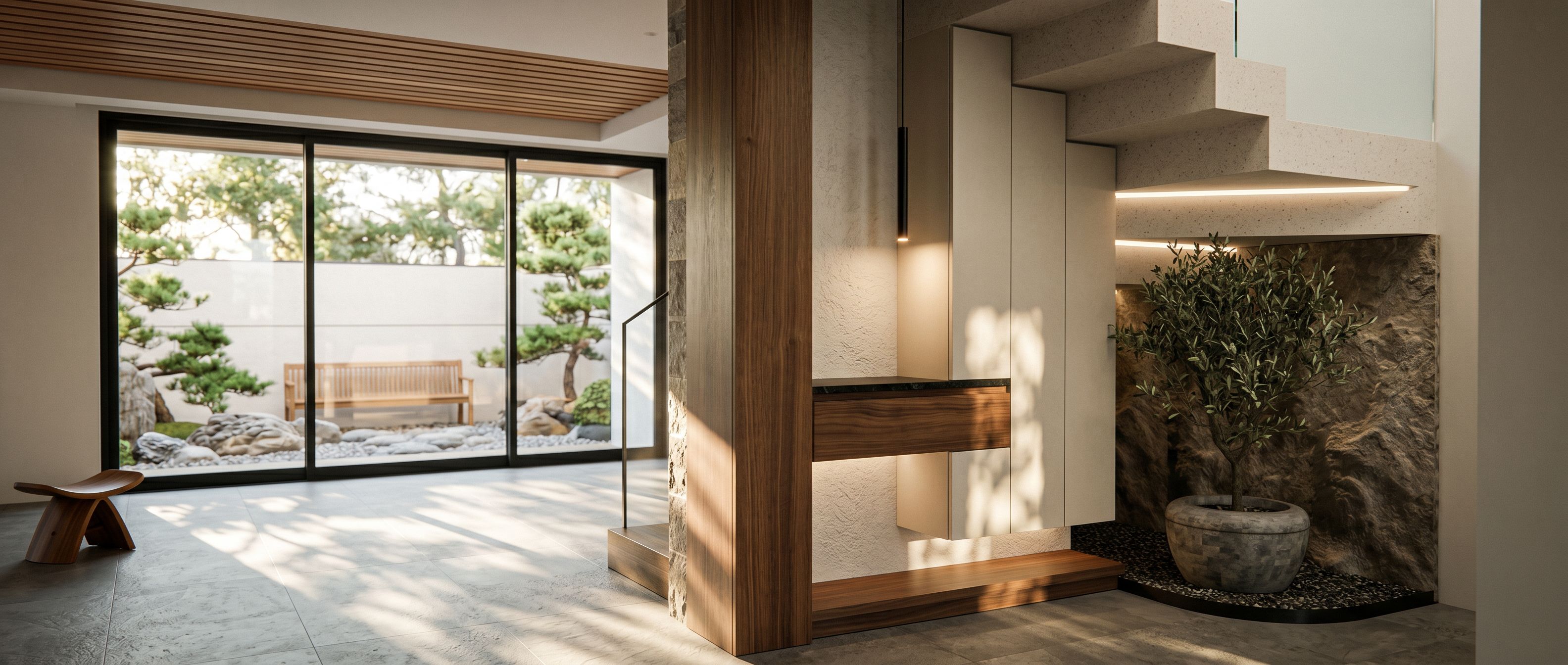 PromptPhoto of a contemporary interior entrance featuring sleek design elements. Highlight the elegant wooden staircase, polished stone flooring, and large glass windows that invite natural light. Emphasize the minimalist cabinetry and integrated greenery, creating a seamless indoor-outdoor connection. Showcase soft shadows cast by the sunlight filtering through the windows, evoking a tranquil ambiance. Capture the scene from a low angle to accentuate the architectural lines and depth, using a wide-angle lens for a dynamic perspective that enhances spatial awareness., keep exact camera angle