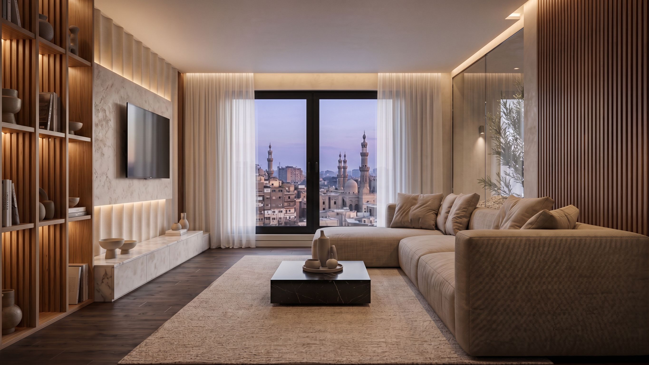 PromptBehind the sofa there is wood strips like in reference image 1 try to make it same proportions and same materials., keep exact camera angle