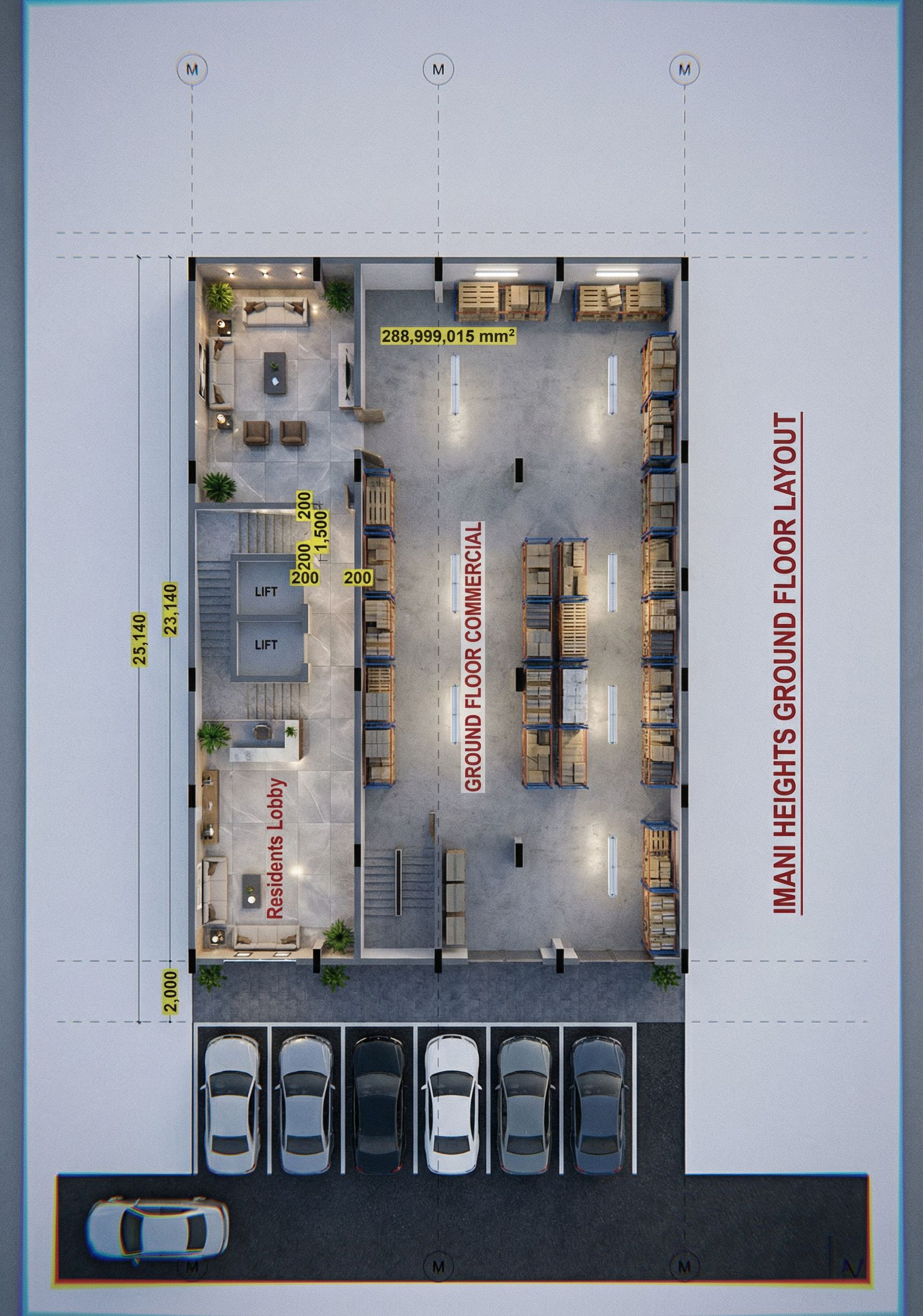 LAYOUT SHOWING STORAGE SPACE ON THE RIGHT AND RESIDENTIAL ENTRANCE AND LOBBY ON THE LEFT. USE CERAMIC FLOOR TILES AS FINISHES. SHOW PARKING INFRONT., keep exact camera angle