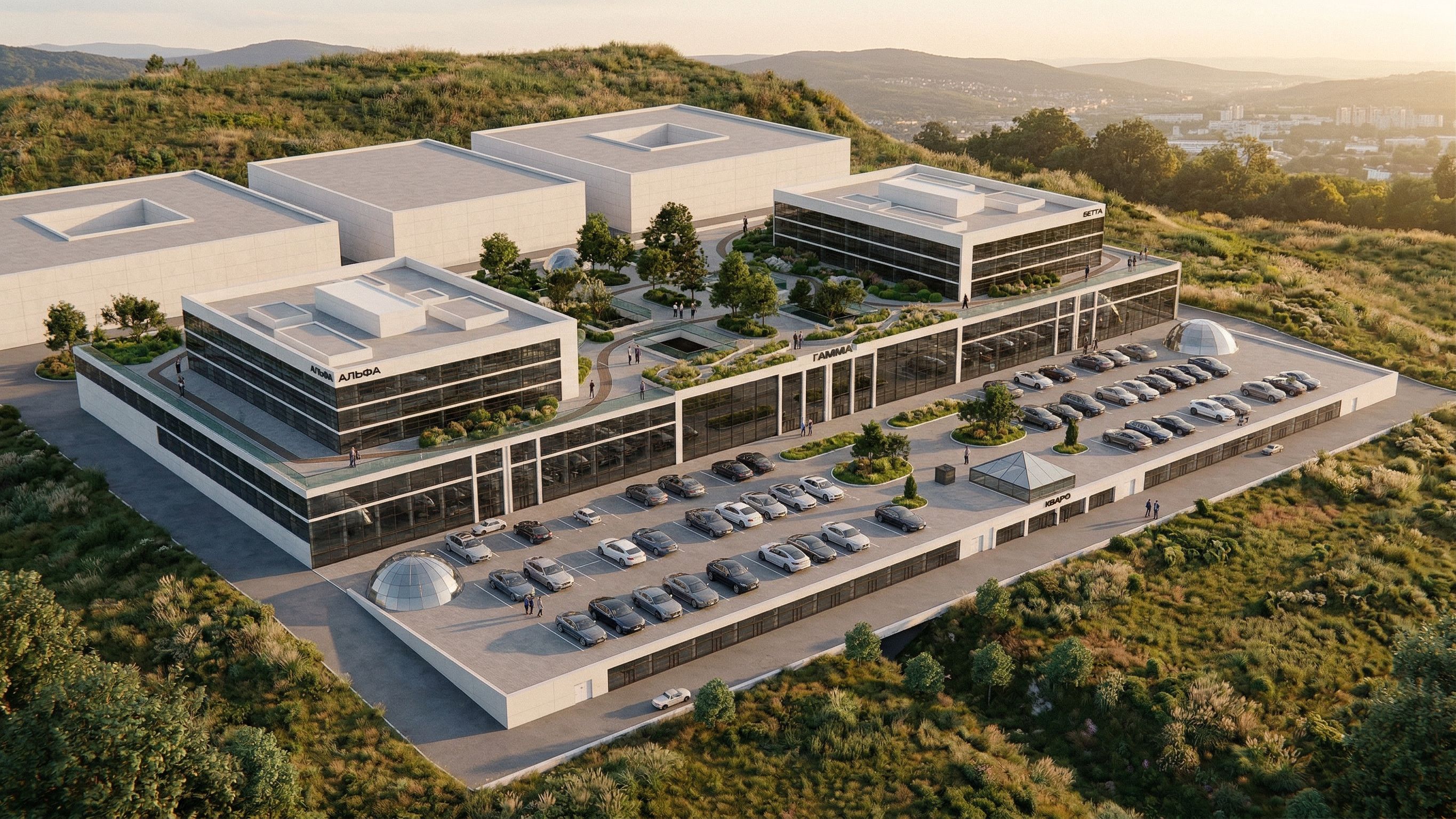 PromptA photograph of a modern industrial and office complex. The façade is finished with elegant tinted windows and white sandwich panels. The building is located on a hillside. The design features a multi-level layout and green terraces. Tinted roof skylights allow light into the building. Glass roof railings allow people to stroll along the roof and enjoy the beautiful views. Businessmen in business suits leisurely walk to work. Business-class cars park in the open-air parking lot. Warm daylight casts soft shadows, highlighting the texture of the materials and accentuating the building's lines. The photograph was taken from above with a wide-angle lens, emphasizing the overall layout and integration with the surrounding environment. Maintaining a precise camera angle is essential., keep exact camera angle
