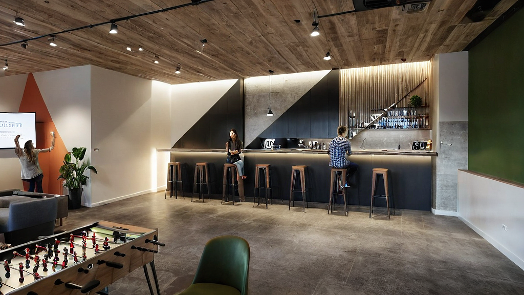 PromptThis is a common area in a student accommodation. There is a plug and play area with bar stools and people using laptops and computers. very vibrant space. Insert great light fixtures on the ceiling; no bulkhead. Keep all the exact colours and shapes on the wall. The floor is polished concrete screed. Enhance the foosball table and TV screen. More lights on the ceiling.