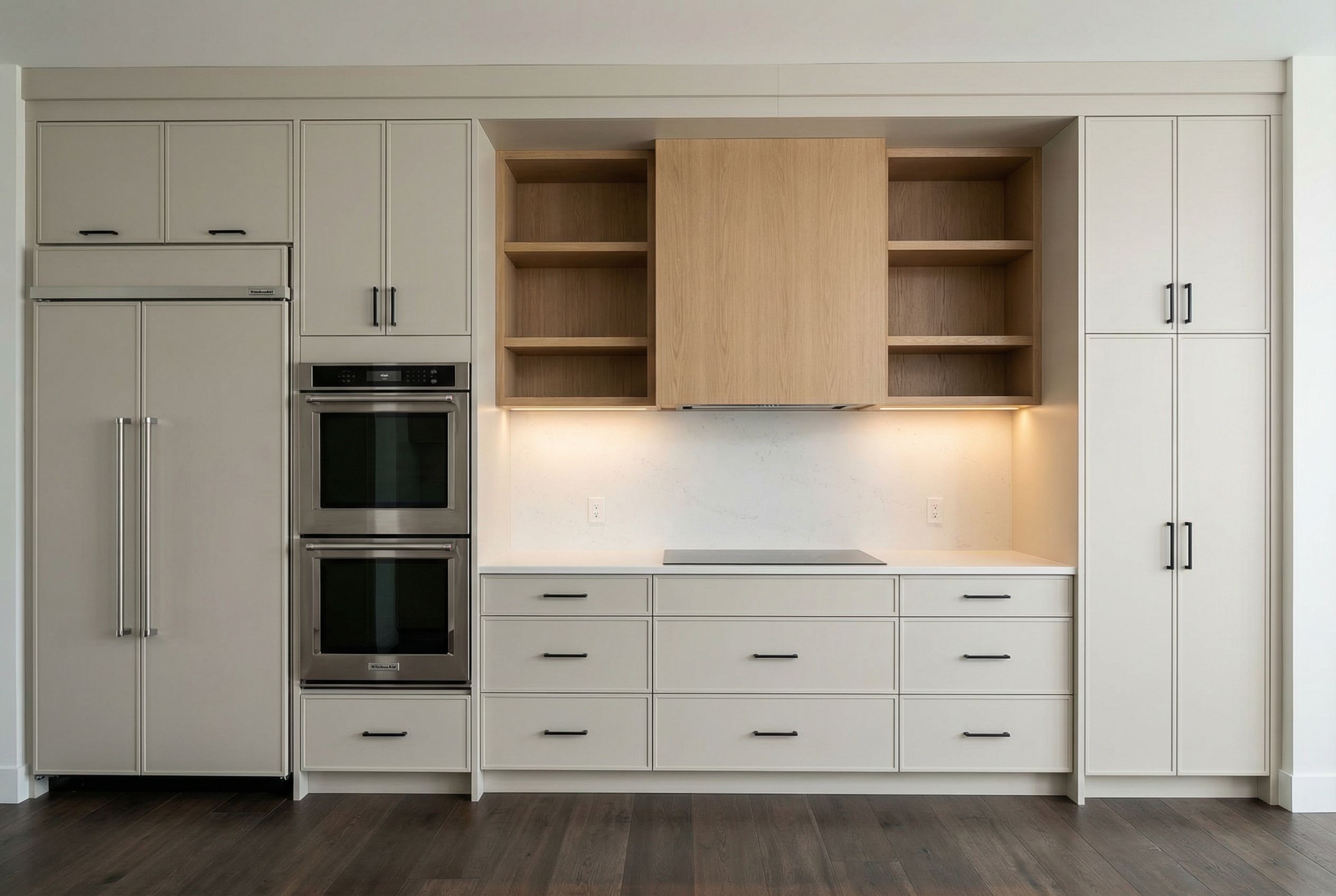 interior design rendering, render this drawing into photorealistic rendering, create an elevation using the drawing provided. all millwork to be painted benjamon moore rodeo 1534 except for hood and shelves, which are a light oak. valance to run straight across and be painted benjamon moore rodeo 1534. all doors and drawers to be flat slab for a sleek look. all pulls to be black. countertop material to be cosetino white 17 tier one silestone and to be used for backsplash . do not add any islands, this is just an elevation of the back wall of the kitchen . pay attention too the colour that the millwork is to be , eye level view, high quality, professional, detailed scene