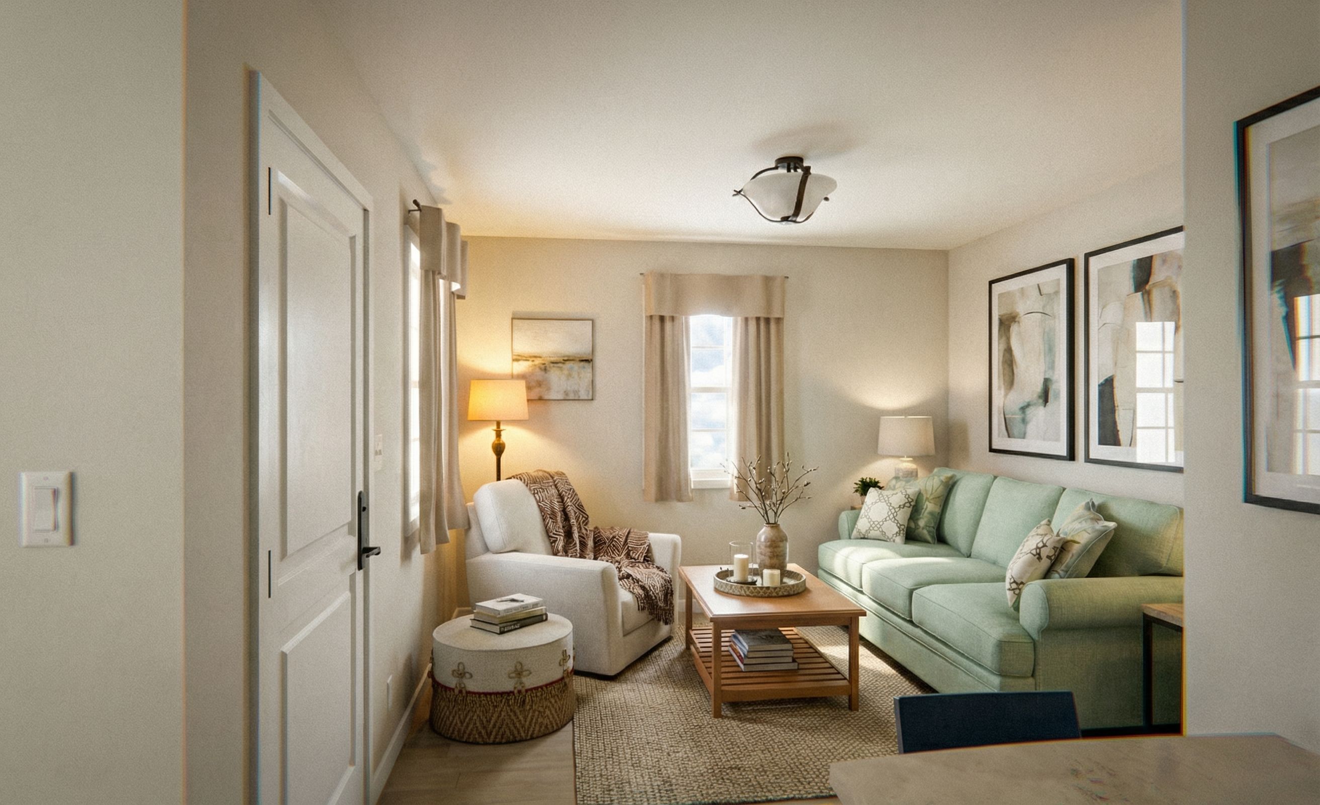 Show some accessories in the room and art on the walls. Don't change the furniture or curtains. Partly cloudy day, mid-morning