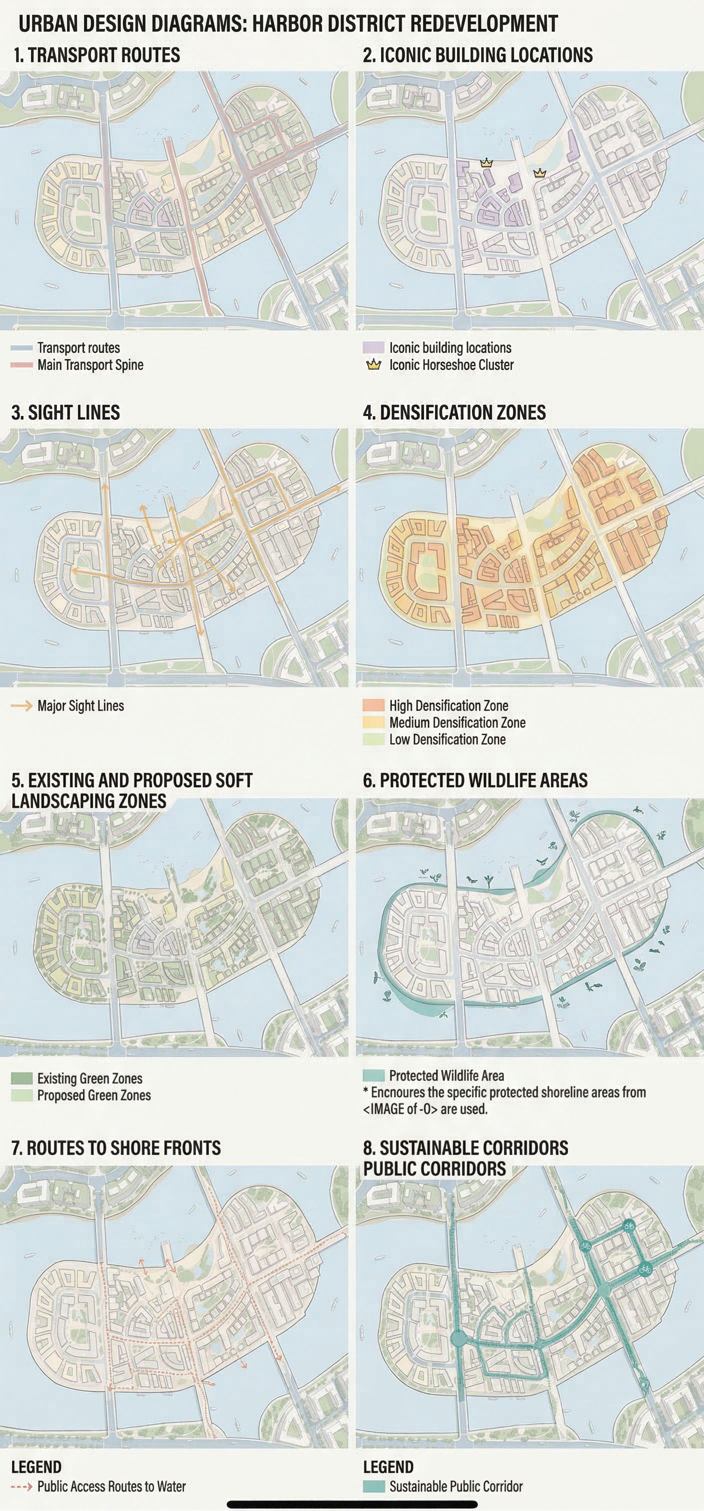 Produce a series of 8 separate Urban Design Diagrams on one page based on the uploaded image, in the style of the reference images; 1. showing Transport routes, 2. Iconic building locations, 3. Sight Lines, 4. densification zones, 5. existing and proposed soft landscaping zones, 6. Protected Wildlife areas 7. Routes to Shore fronts and 8. sustainable corridors public corridors. Use pastel colours to differentiate each item