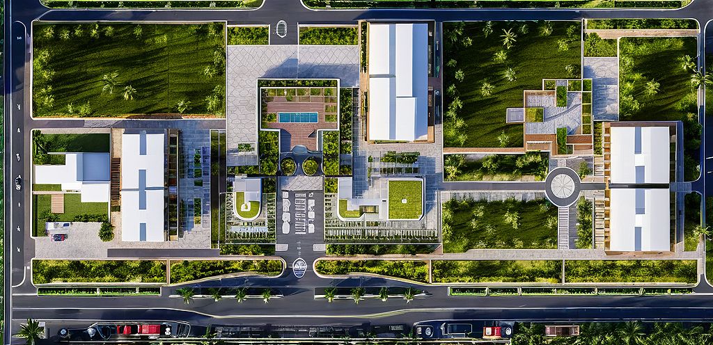 Photo of a proposed shopping mall, hotel, and filling station in Kolwezi, DRC, showcasing a modern architectural design with varied materials and textures. The layout features extensive green landscaping, structured parking areas, and functional zones. Natural lighting bathes the site, casting soft shadows across the pathways. Captured from a bird's-eye view with a wide-angle lens to emphasize spatial relationships and scales. Bright colors highlight distinct areas, creating a lively urban setting. Seen from above 10,000 feet.