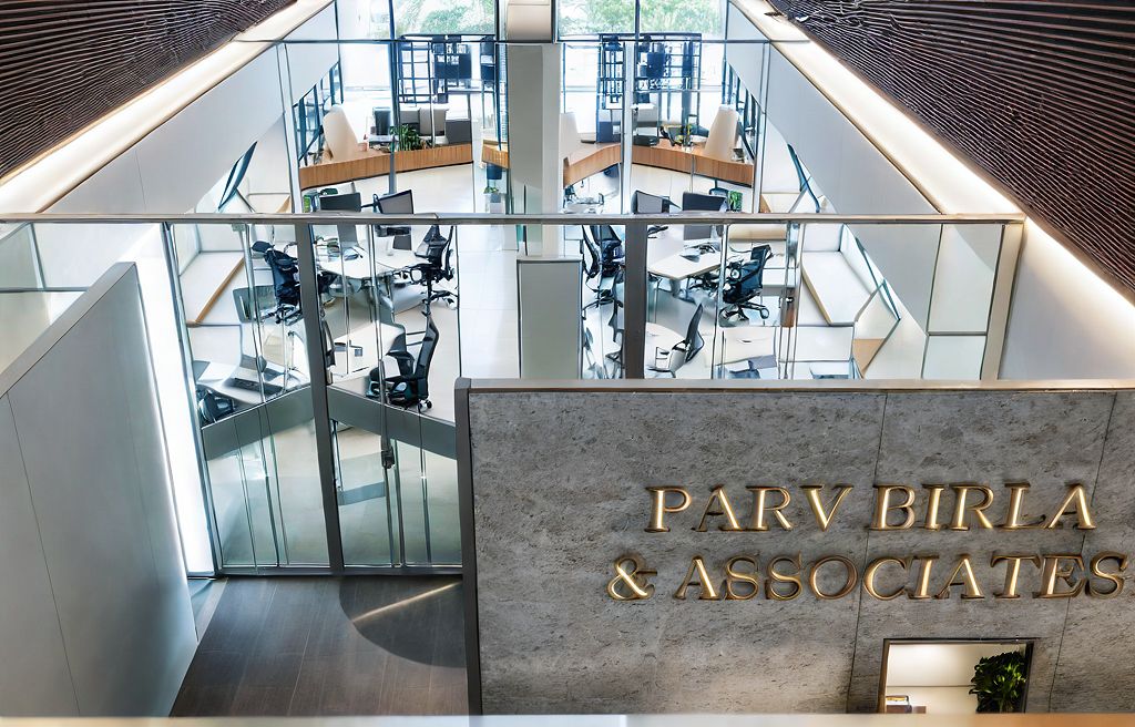 Photo of a modern office interior featuring open-plan workspaces. Emphasize sleek glass partition walls, wooden workstations with ergonomic chairs, and integrated technology. Surrounding elements include a contemporary reception area with a polished stone wall displaying "PARV BIRLA & ASSOCIATES." Natural daylight floods through large windows, casting dynamic shadows. A high-angle perspective captures the layout and spatial arrangement, using a wide-angle lens to enhance depth and scale, highlighting the clean, minimalist aesthetic of the office design.