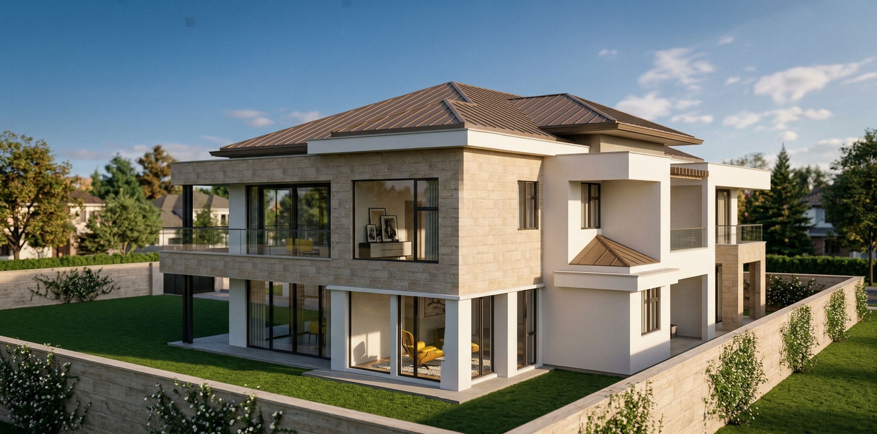 PromptPhoto of a modern residential building featuring expansive glass walls and elegant stone detailing. The design incorporates sleek columns and a prominent roofline. Surrounding the structure is a lush green lawn. The scene is illuminated by soft afternoon sunlight, casting gentle shadows across the facade. A low-angle perspective highlights the building's striking features, while a wide-angle view captures the impressive scale and surrounding environment, emphasizing the harmonious balance between nature and architecture., keep exact camera angle