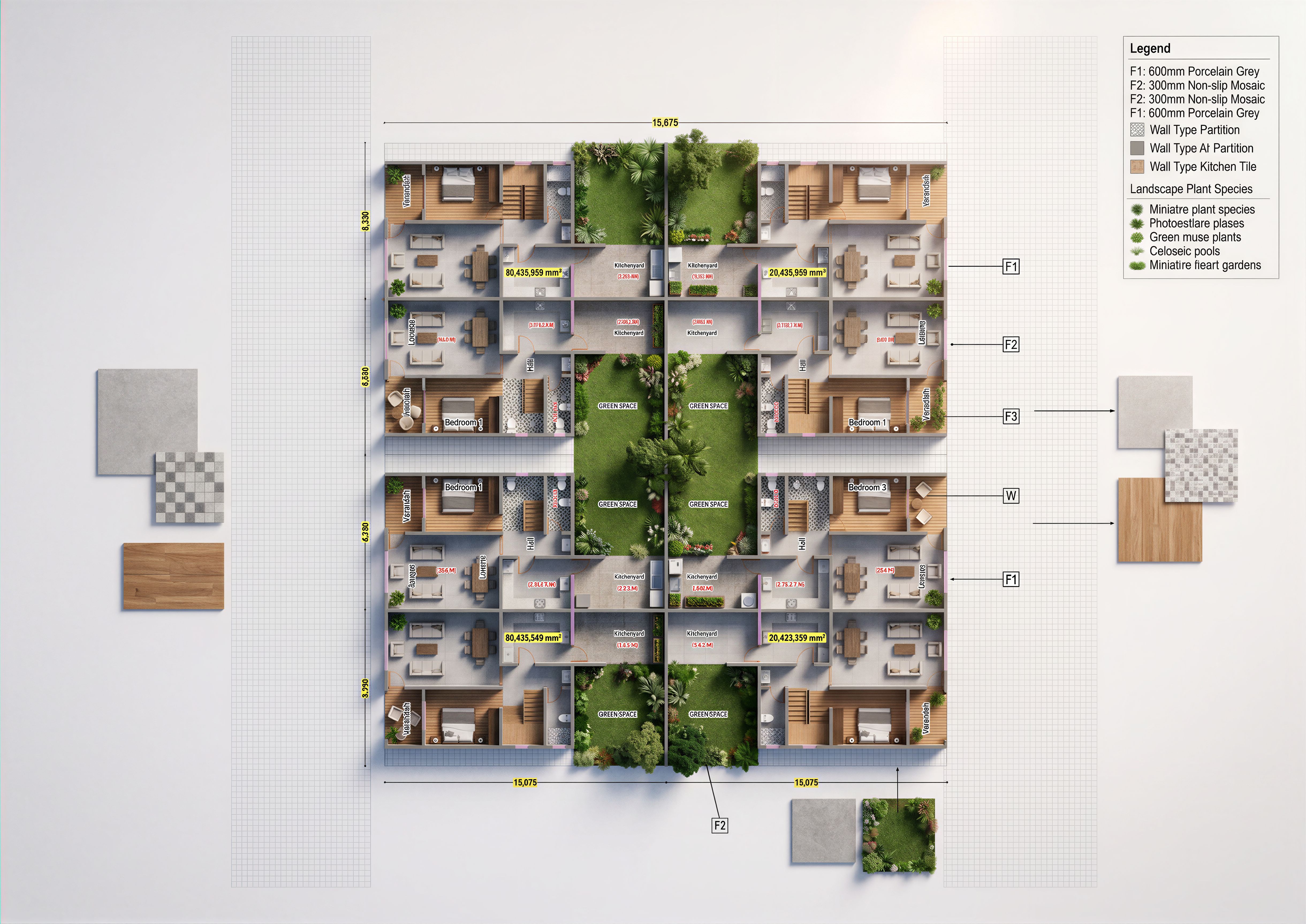 EnhancedPromptLAYOUT SHOWING THE INTERIOR OF A HOUSE CLEARLY SHOW THE PARTITIONS WITH THE FLOOR FINISHES. USE CERAMIC TILES ON THE FLOORS. INCLUDE A UTILITY AND KITCHEN YARD AREA. CLEARLY INDICATE THE WASHROOMS. MAKE LAYOUT HIGH RESOLUTION OF 8K. SOME LANDSCAPING IN THE COURTYARD AREA INDICATED IN GREEN., keep exact camera angle