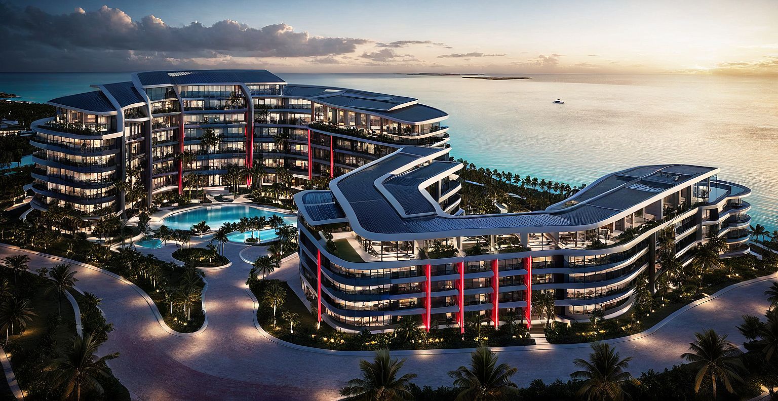 Futuristic render of a Lamborghini-inspired luxury residential complex in Marina Cap Cana, Dominican Republic. It features two symmetrical glass towers with curved dark gray metallic structures and red LED accents. Surrounded by palm trees, yachts, and illuminated gardens, a central pedestrian path leads to the entrance. Set at sunset, warm interior lighting enhances the tropical ambiance. The sea is present both behind and in front of the building, highlighting its exclusive waterfront location.