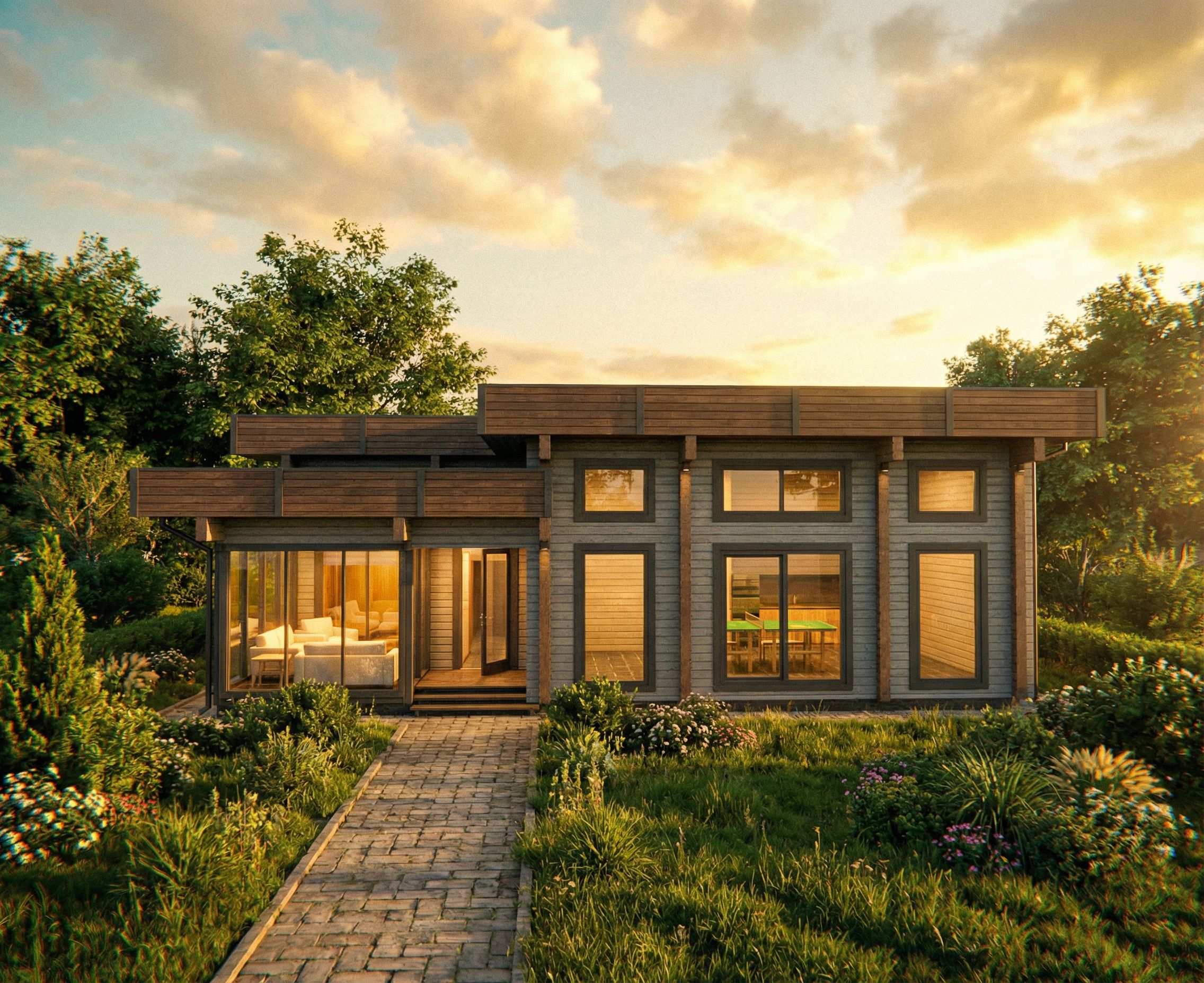 Promptarchitectural visualization of a private house made of gray glued laminated timber with contrasting ends on a human scale, keep exact camera angle