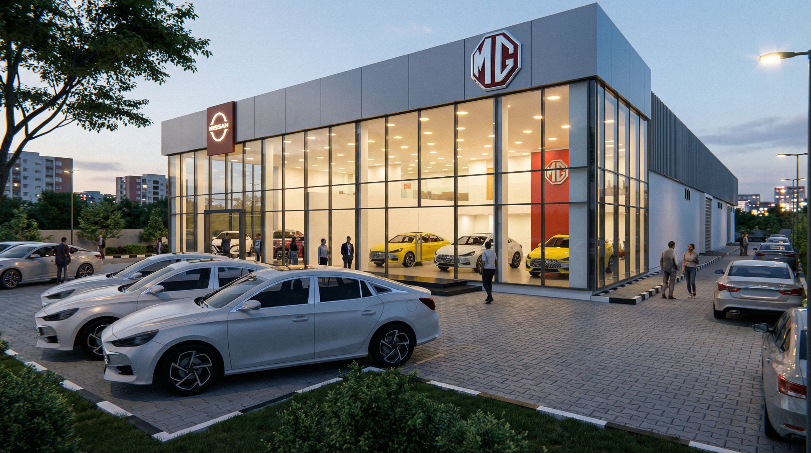 Photo of a modern car dealership featuring large glass facades and sleek metal cladding, showcasing intricate design elements like minimalist signage and well-defined architectural lines. Urban setting with a paved parking lot surrounded by greenery and distant residential buildings. Early evening lighting with soft natural tones and distinct artificial highlights illuminating the showroom. Captured from a low angle, emphasizing the building's height, with a wide lens to incorporate the inviting atmosphere and multiple vehicles in the foreground., keep exact camera angle