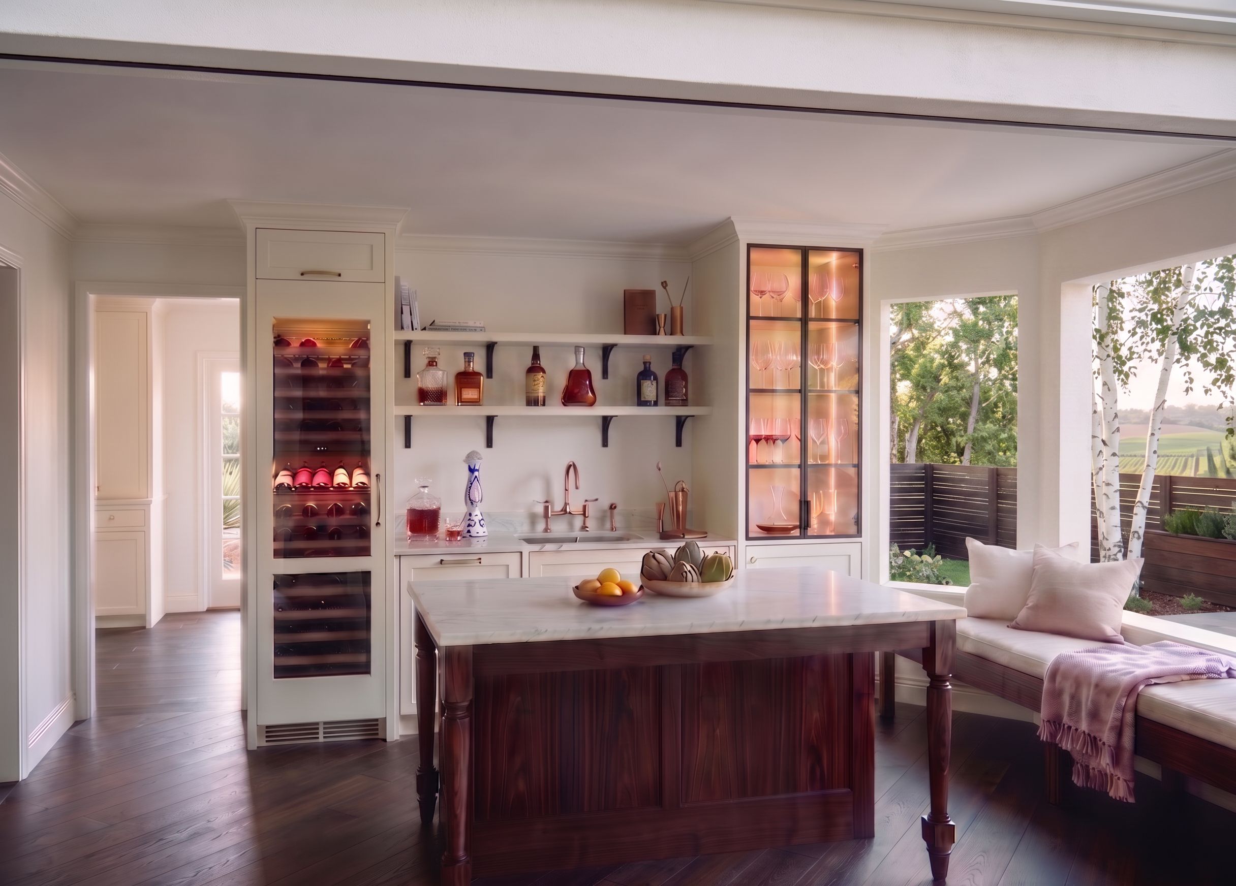 delete the desert landscaping and add a fence with trees beyond . delete the pergola. make the metal framed glass doors on the right a black metal , keep exact camera angle