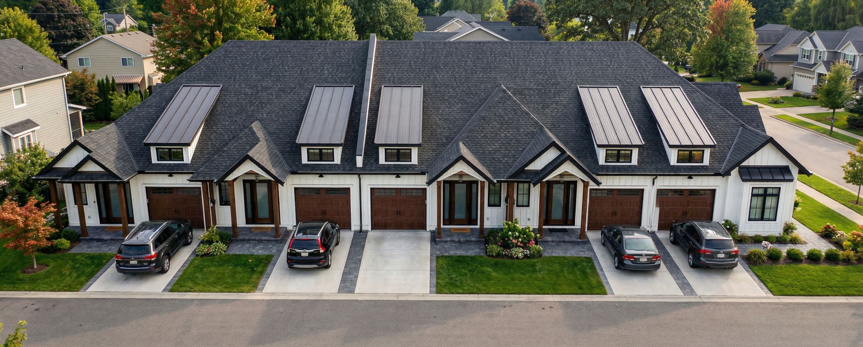 PromptShow me the building straight on, featuring all the front porches, gardens, cars, greenery