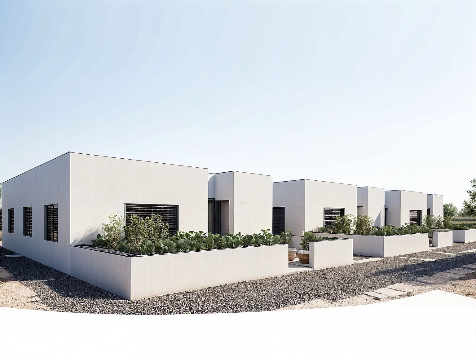 A perspective render of a modular residential building within a sustainable low-income village. The building has a compact, expandable design with a minimalist, Compressed Earth Blocks CEB façade with Steel Frame with white paint. The flat roof is equipped with photovoltaic solar panels. Architectural details are simple and functional, allowing for horizontal or vertical expansion in the future. Only Windows are shaded by louvers to enhance passive cooling and reduce direct sunlight penetration, emphasizing the building’s environmental responsiveness. The surrounding context includes: •	Clearly defined streets, sidewalks and pedestrian paths adjacent to the building •	Public spaces nearby with visible activity e.g., people walking, resting, children playing •	Vegetation and shading from native trees integrated into the streetscape The environment should be lively and active. Show people interacting with the space — walking on sidewalks, riding bikes, or entering/exiting the building. Use a soft daylight setting with warm tones, emphasizing material textures and casting natural shadows. Highlight the simplicity and scalability of the architecture.
