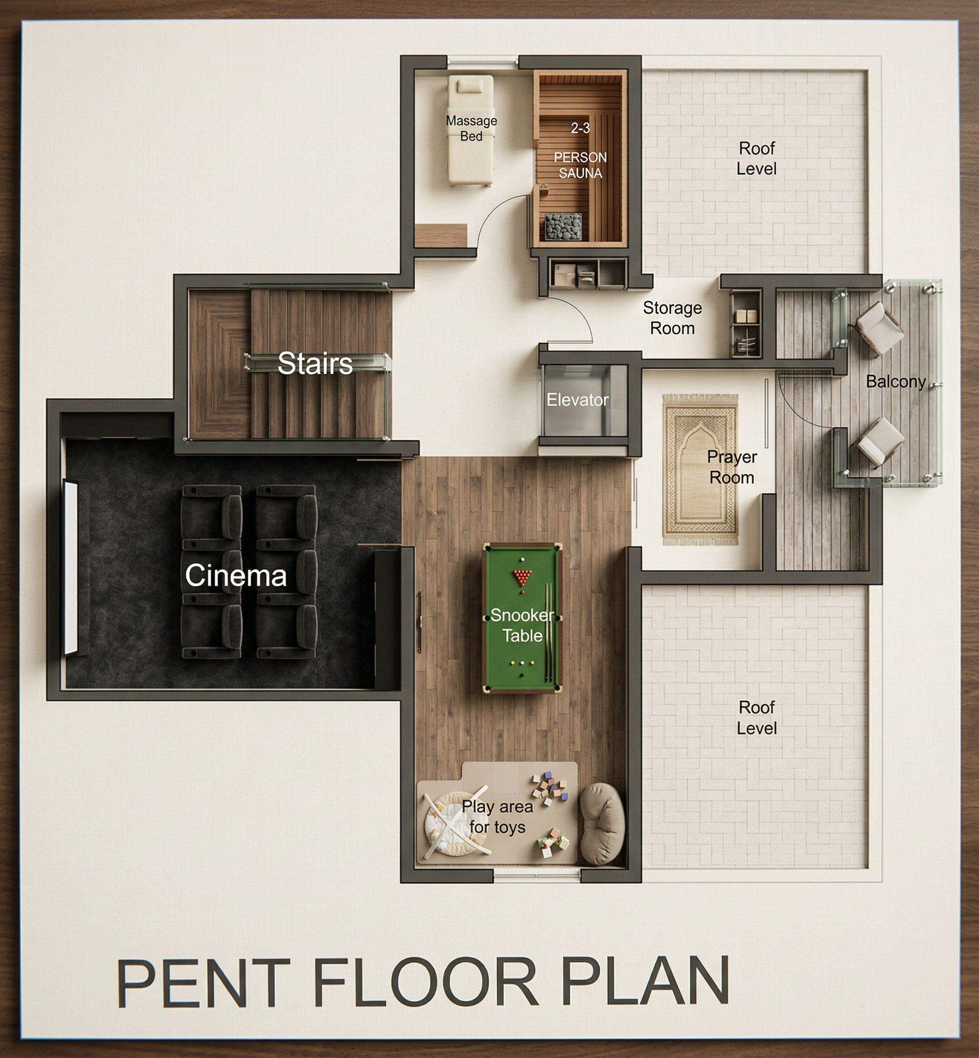 PromptCreate a high-quality 2D top-view floor plan of a luxury penthouse level featuring: cinema, snooker area, kids play area, prayer room, massage room, 2–3 person sauna, storage, elevator lobby, stairs, balcony, and roof terraces. Style: modern luxury, clean, minimal, presentation board Colors: beige, cream, wood, light grey, white Details: clear labels, furniture layout, different floor finishes, soft shadows, glass balcony railing, keep exact camera angle