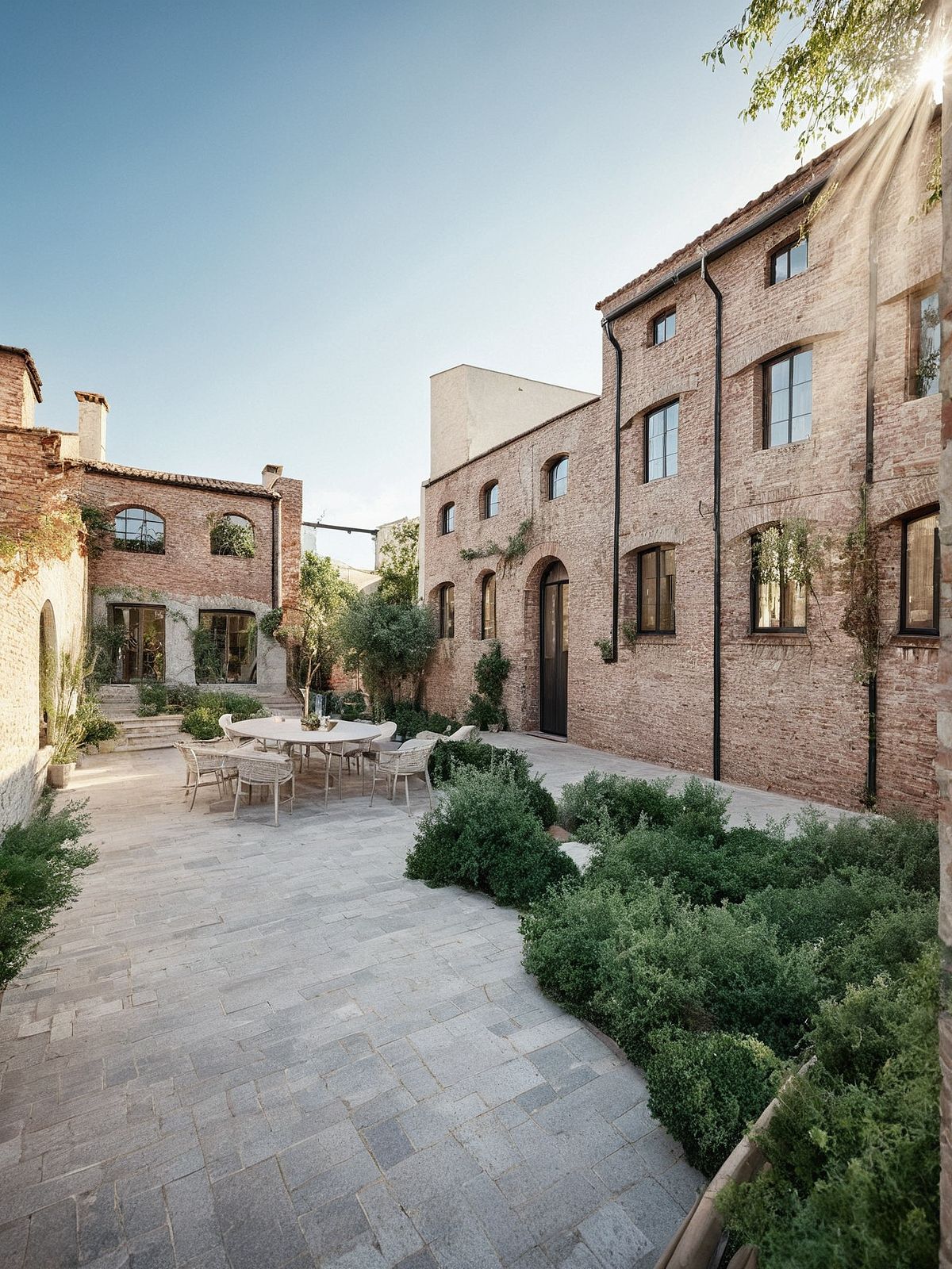 re-imagined modern facade in red brick, with big arched windows with black frame and red brick details . Courtyard with Mediterranean vegetation, pedestrian path and seating areas