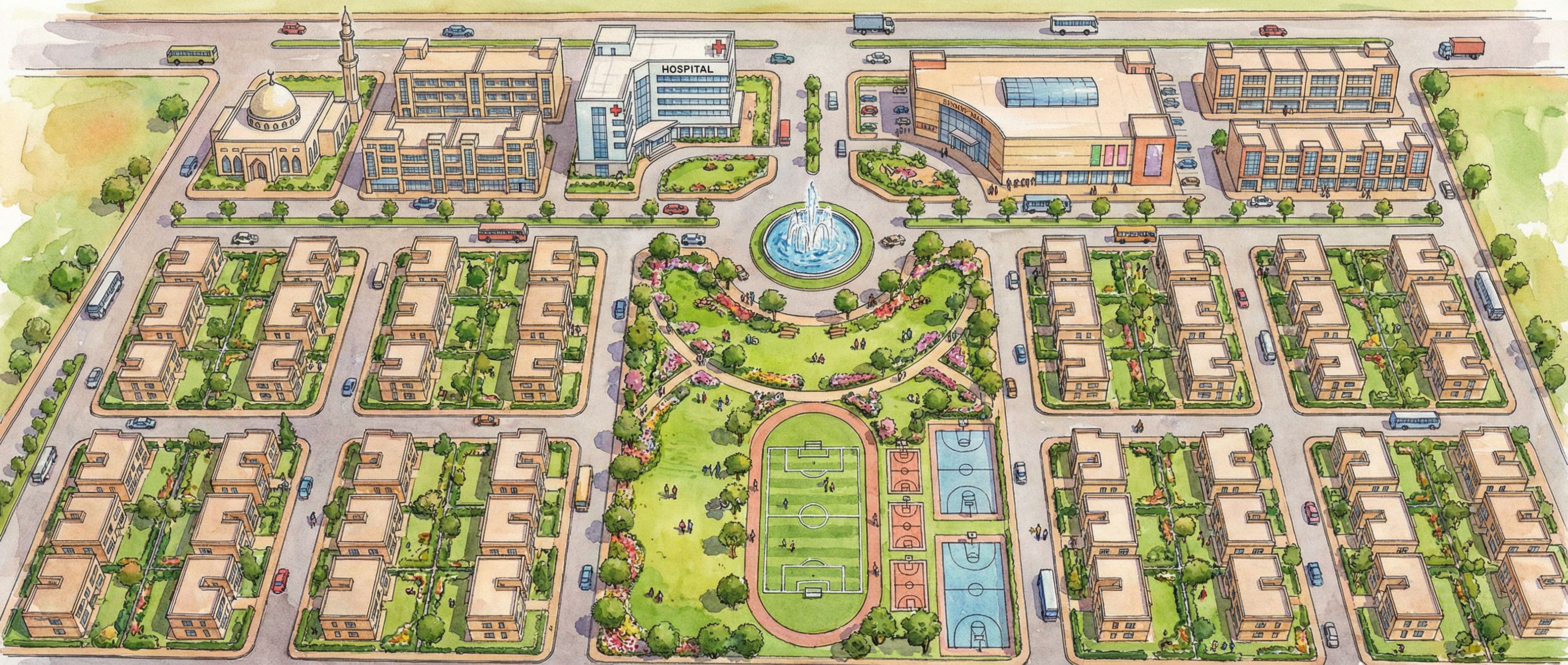 urban masterplan visualization, render this drawing into watercolor painting, MASTER PLAN FOR MIXED USE DEVELOPMENT WITH UNITS IN PLOTS OF SIZE 20 METRES BY 10 METRES. A COMMERCIAL FRONT ON THE MAIN ROAD WITH FOUR STOREY COMMERCIAL BUILDINGS INCLUDING MOSQUES, HOSPITALS ,SCHOOLS, SHOPPING MALLS. LANDSCAPING AND A MAIN WATER FOUNTAIN AND LANDSCAPING AT THE CENTRE CIRCULAR FEATURE. ALL THESE FEATURE ARE TWO DIMENSIONAL, keep exact camera angle, including people, vehicles, greenery and vegetation, water features, pathways and walkways, high quality, professional, detailed scene