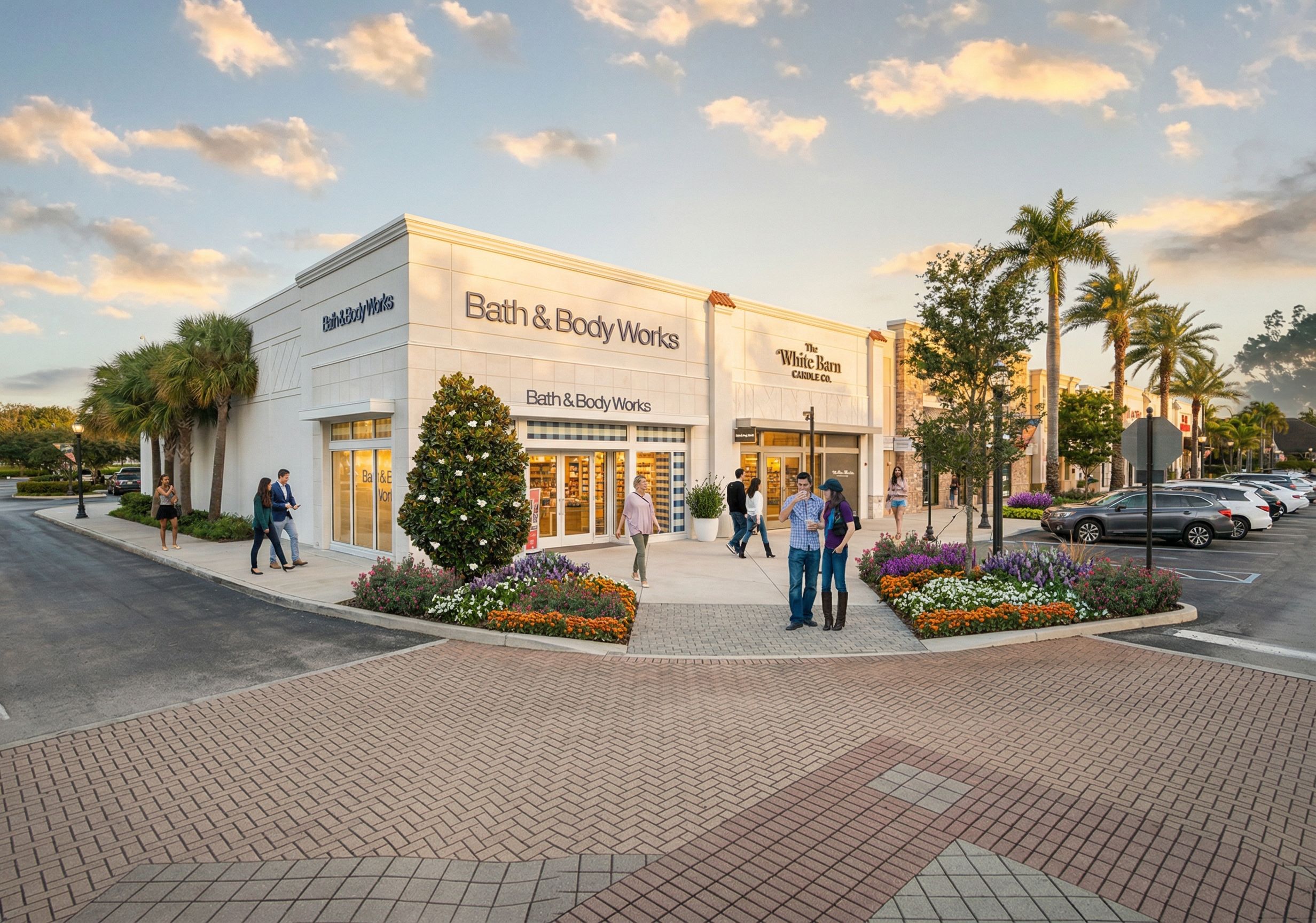 PromptPhoto of a commercial retail building featuring a modern façade with large glass windows and a clean white exterior. Architectural details include neatly arranged outdoor landscaping with vibrant flower beds and palm trees. The surrounding urban environment offers a lively atmosphere with pedestrians walking and parked cars nearby. Natural daylight creates soft shadows, enhancing the building's textures. Taken from an eye-level angle, the frame captures the structure prominently, with wide-angle lens to emphasize the bustling street and neighboring shops, offering a vibrant community feel.Keep the camera angle as is., keep exact camera angle