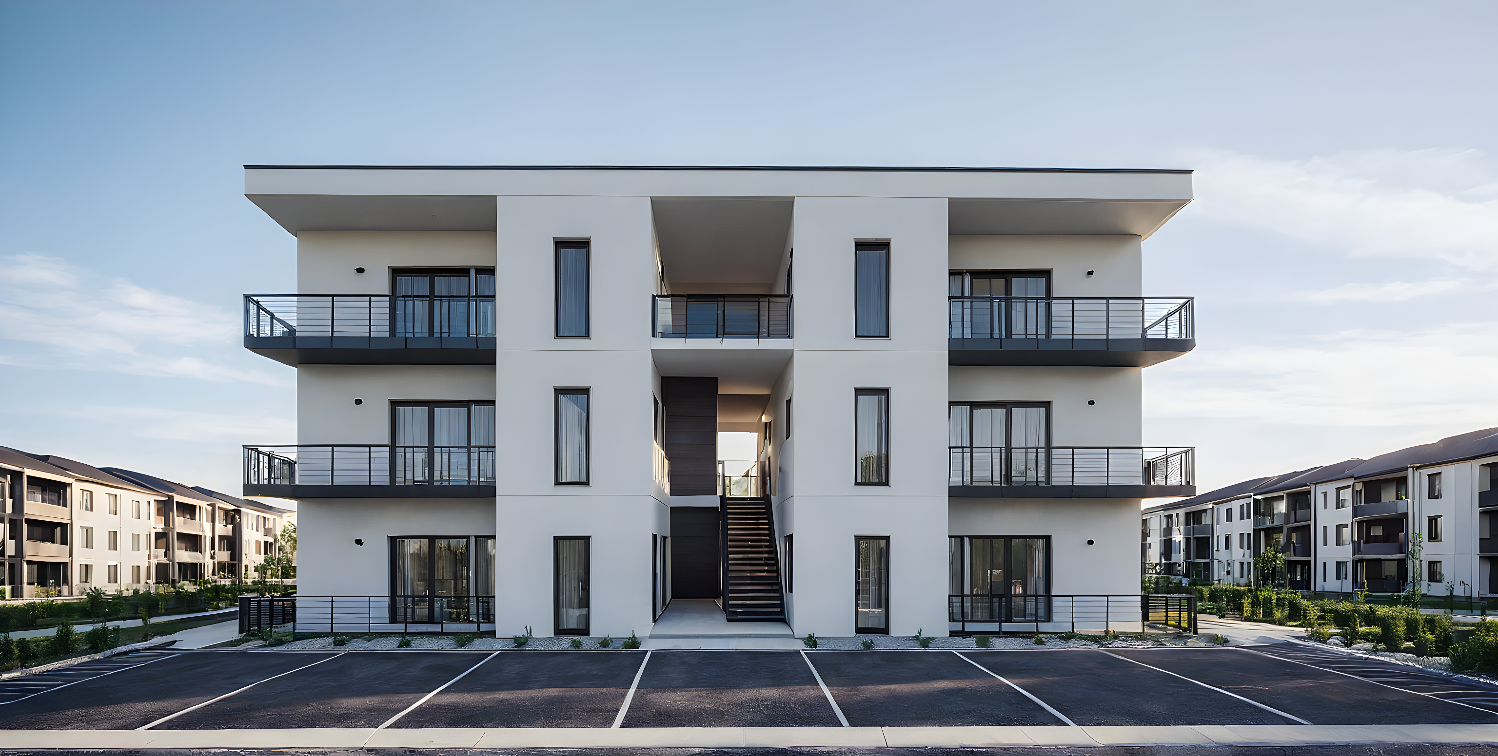 Modern Apartment Complex, next to houses, parking in front