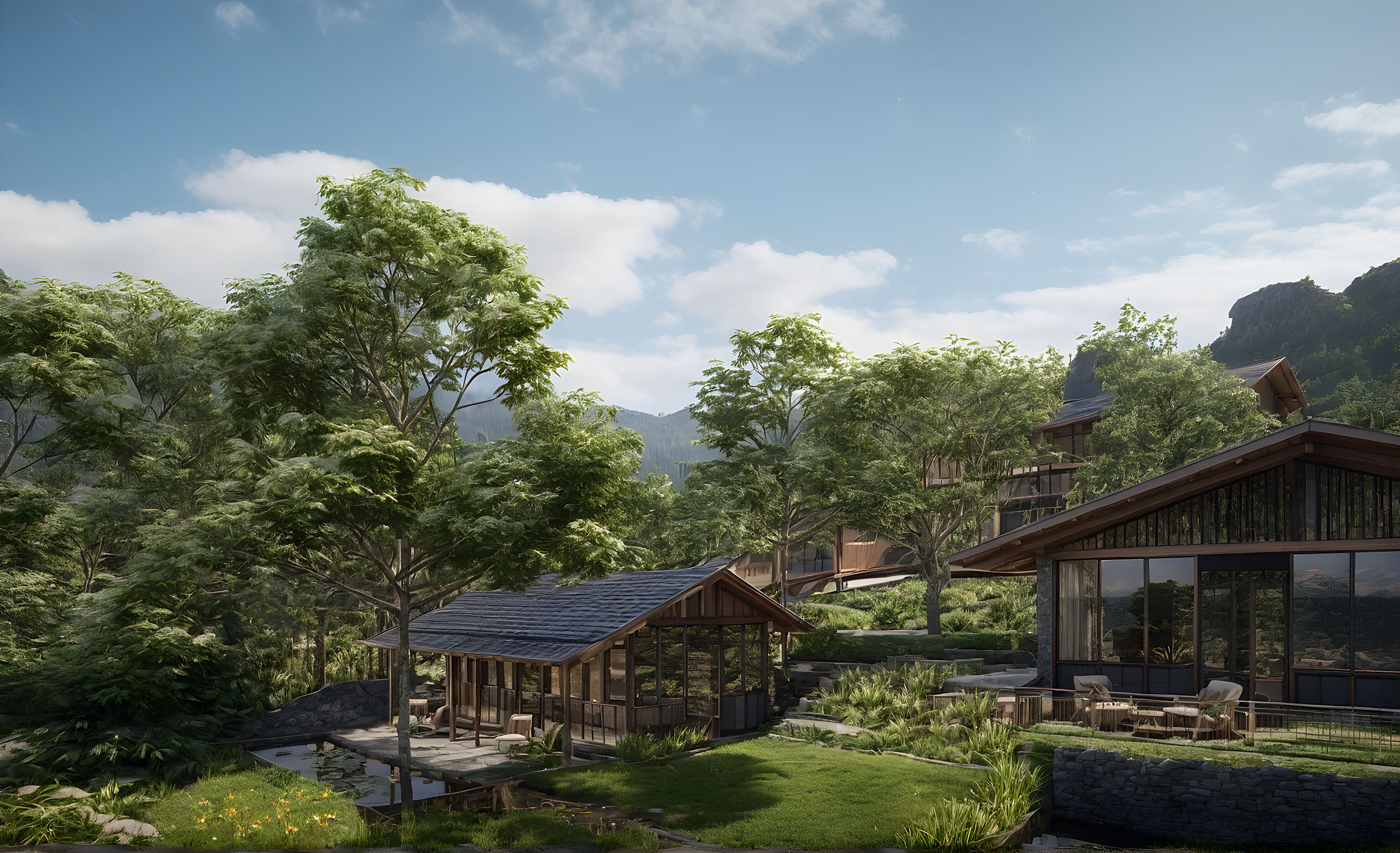 Promptenhance this morning render of a mountain resort. retain existing design elements like the lily pond grass lawn. natural but maintained landscape. generate a hyper realistic render