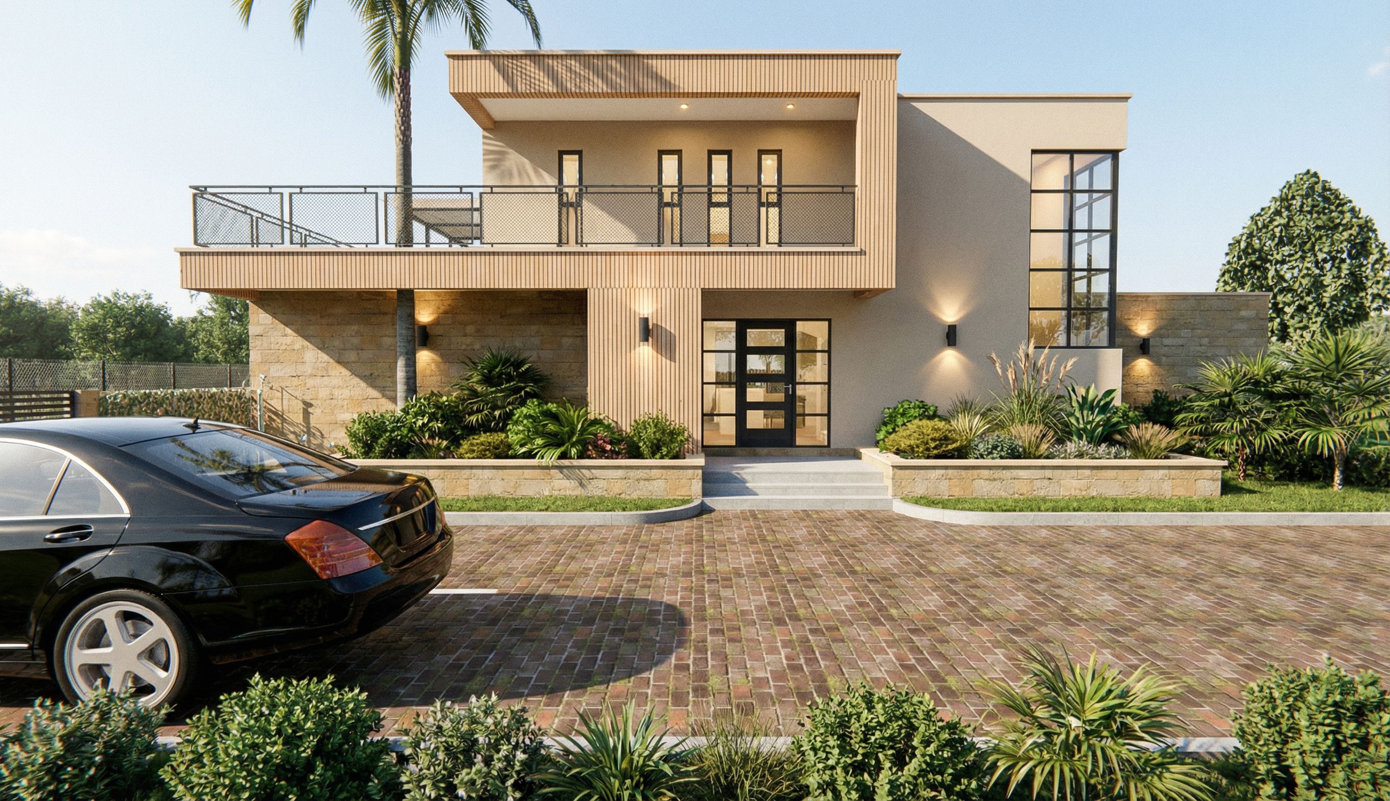 PromptCreate a daytime, ultra-photorealistic exterior architectural render based on the attached reference image, viewed from an eye-level street perspective with a subtle wide-angle lens. The design is a contemporary two-storey residence with smooth warm beige plaster walls, light natural timber vertical cladding, and warm-toned stone cladding at the lower level and planter walls. Black aluminium framed windows and doors with clear glass define the openings, while a flat-roofed upper level features a balcony with black metal and mesh railing. The brick-paved driveway appears clean and slightly weathered, leading to crisp concrete entrance steps. Natural daylight fills the scene under a clear sky, with realistic sun direction casting soft, accurate shadows across walls, paving, and landscaping. Exterior wall lights and balcony soffit downlights are switched on, emitting a warm glow that contrasts subtly with the daylight, while interior lighting is faintly visible through the glazing for depth. A palm tree passes through a cleanly detailed opening in the upper roof slab, allowing sunlight to stream through and cast natural, dappled palm-frond shadows onto the façade and surrounding surfaces. Enhance the landscaping with lush green bushes and low shrubs placed in the stone planters flanking the entrance, complemented by neatly maintained lawn areas and a few taller ornamental plants near boundary walls. Vegetation should feel tropical, balanced, and well-scaled, with gentle leaf shadows adding realism. All materials should display high-resolution textures and subtle imperfections, with realistic glass reflections and accurate global illumination. The overall mood is calm, refined, and premium, suitable for high-end residential marketing, with no people visible and a clean, magazine-quality finish. Turn on interior lights and the two-way exterior wall lights. Keep the exact camera angle., keep exact camera angle