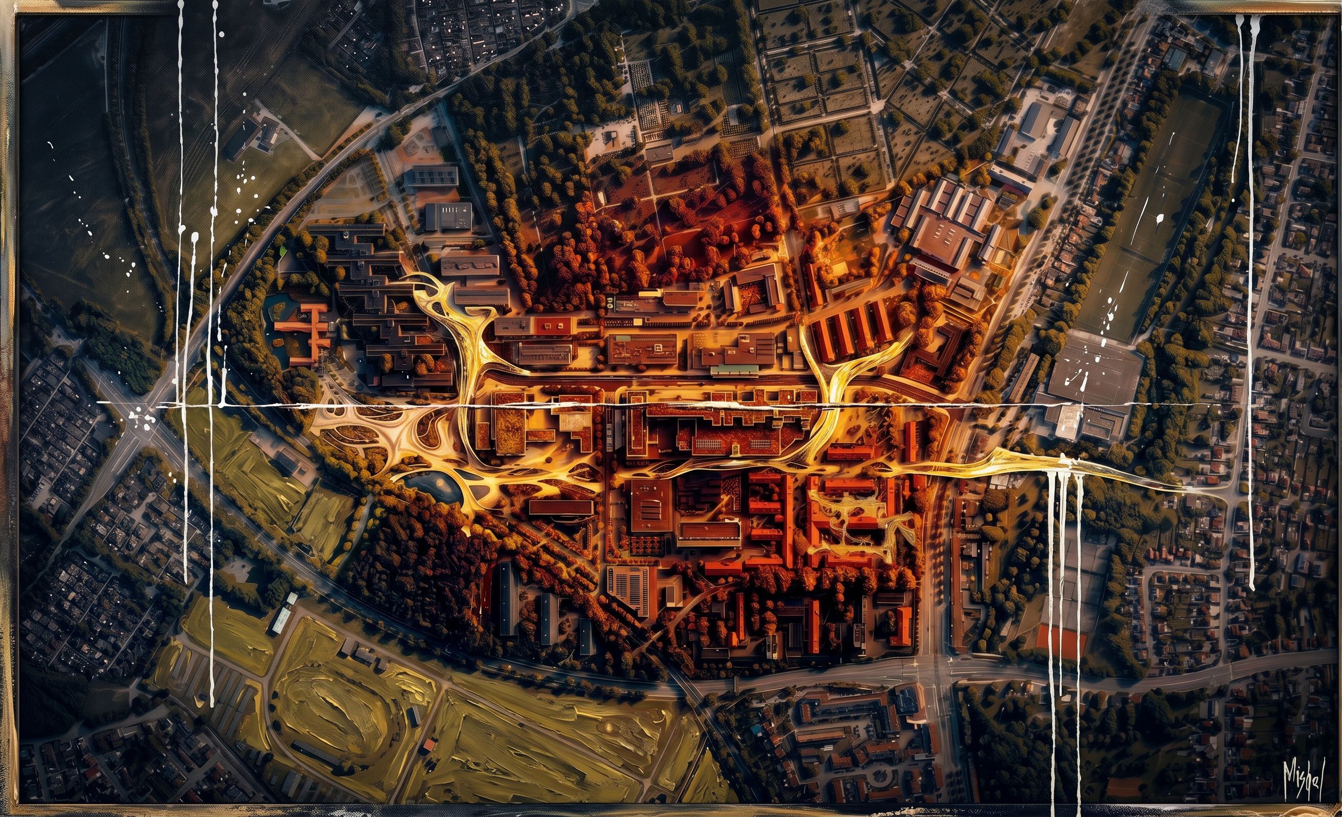 Create an abstract, oil-style painting based precisely on this master plan. Respect the master plan's lines and shapes. Use a mix of styles from the two reference images., keep exact camera angle