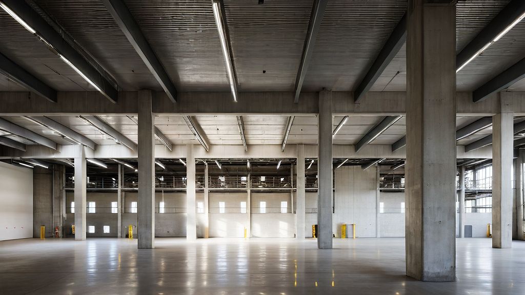 PromptPhoto of an expansive industrial warehouse with high ceilings and open floor space. The design features reinforced concrete pillars and beams, large windows allowing abundant natural light, and minimalist interior details. The urban context includes other industrial buildings in the background, with street access visible. Soft afternoon light creates distinct shadows across the floor, enhancing the architectural depth. Captured from a low angle with a wide-angle lens, showcasing the scale and structure's spaciousness.