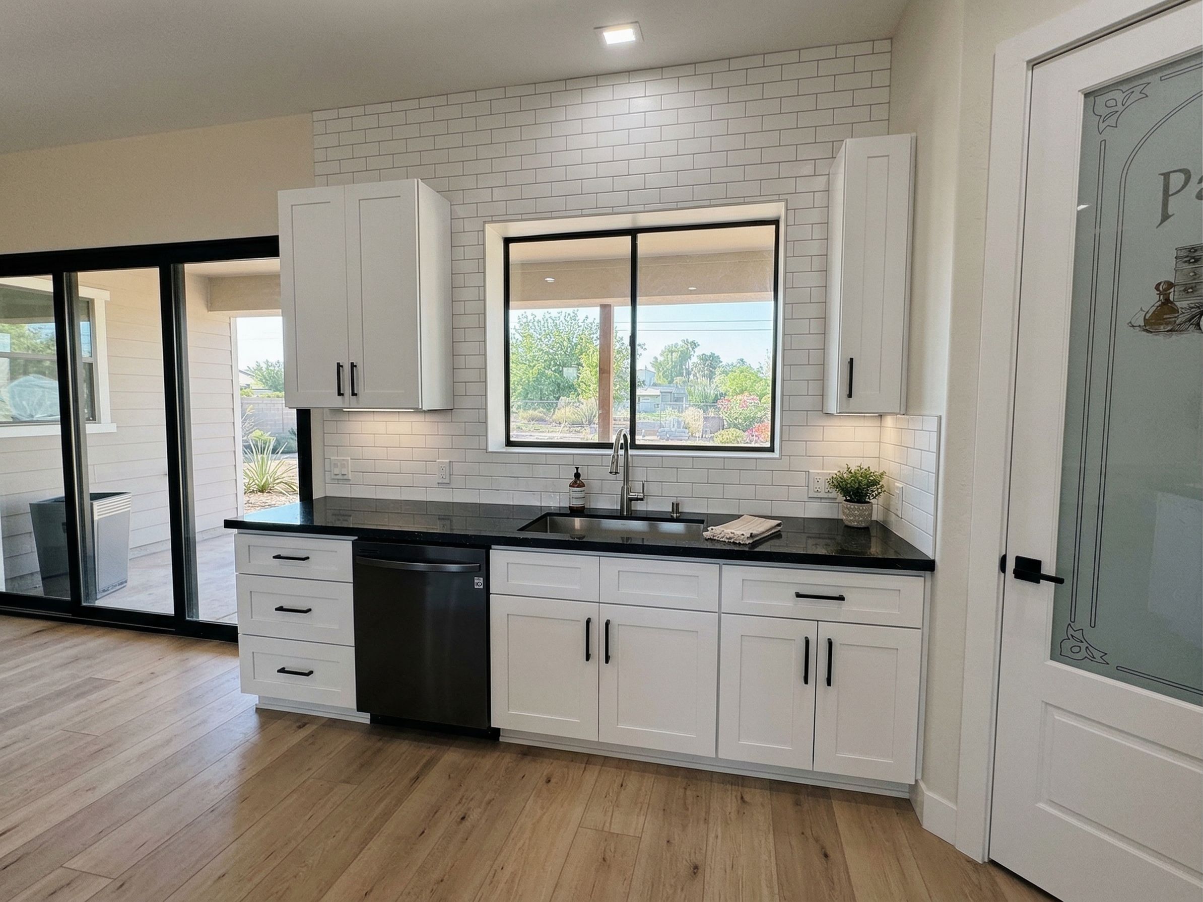 create backsplash with white subway tile that surrounds the window all the way to the ceiling, use black granite countertop with stainless steel sink and gooseneck faucet, wide plank light wood color flooring, black handles on cabinets, black stainless steel dishwasher in lower cabinet open space, keep exact camera angle
