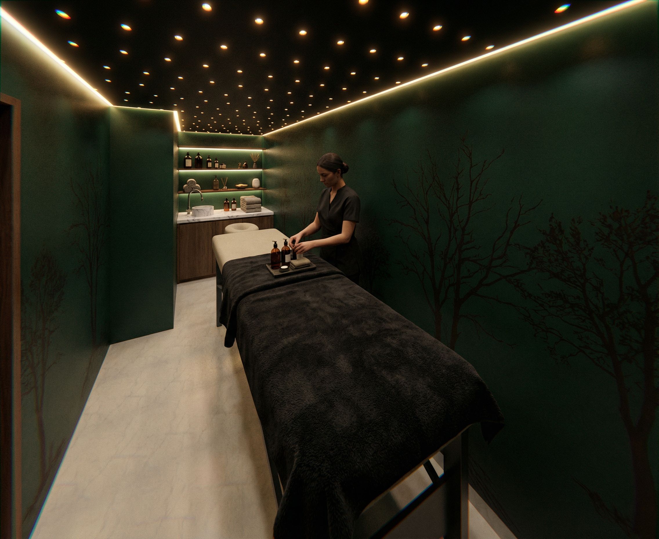 on this picture there are small circular holes on the ceiling. These are for small LED lights to create a brim atmospehre. The walls are going to be dark emerald green with satin kinda texture. The counter top is white marmore and below the whole unit except for basin and the tap are dark oak. The corners and edges of the ceiling has also opening to have horizontal lighting aswell. Add bottles on the shelves and a covering towel on the massage tale with a masseuse next to it. Add also dark brown tree sillouhette sketches on the walls aswell. Not too visible but it should create a subtle embience , keep exact camera angle