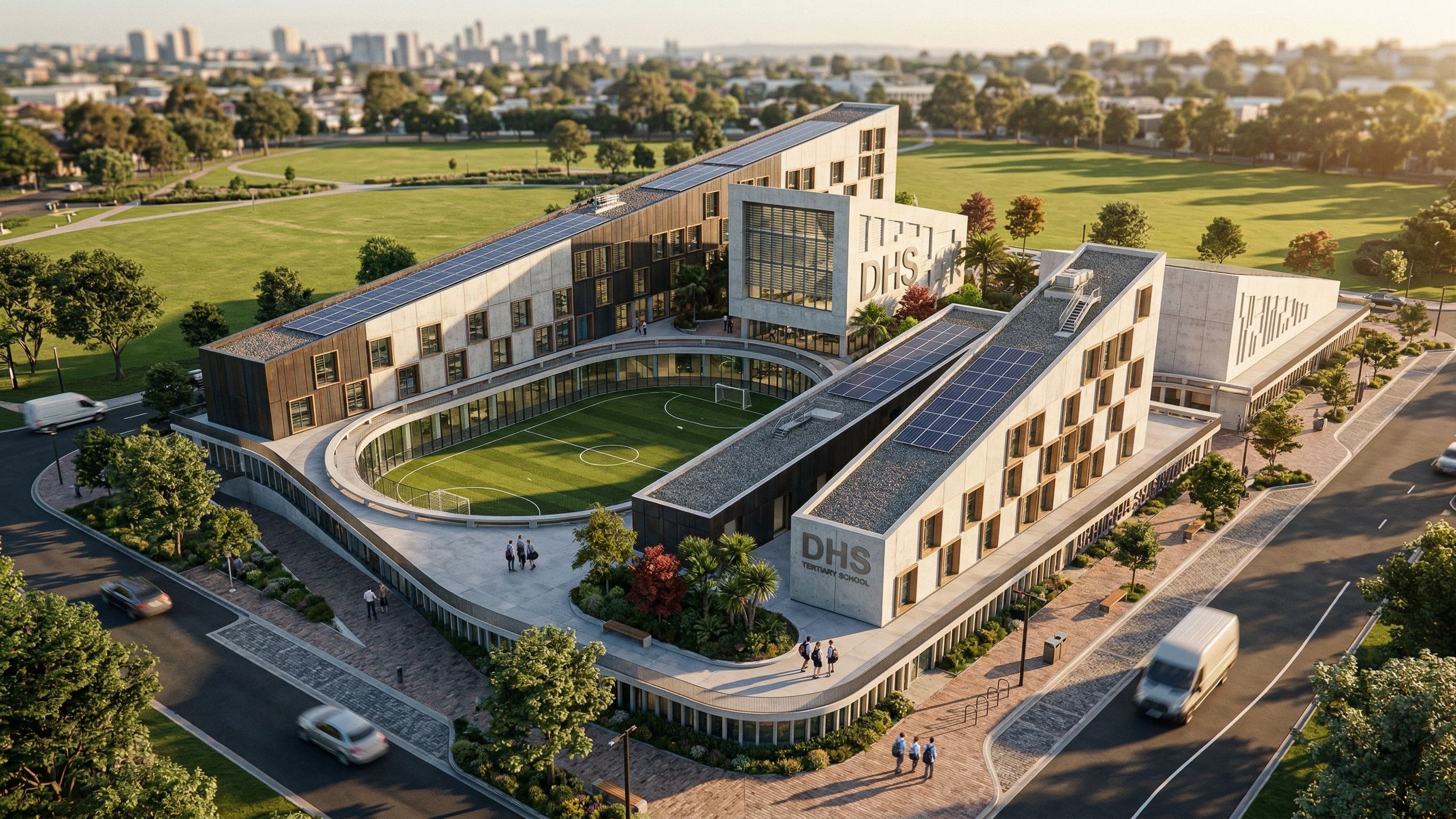 PromptPhoto of a modern multi-story school institutional building with asymmetric geometric design elements, featuring facades, large glass windows, and varied rooflines. Set in a landscaped urban environment, surrounded by manicured greenery and walkways. Warm afternoon sunlight casts dynamic shadows across the structure, enhancing its textures. Captured from a high-angle perspective with a wide-angle lens, focusing on the unique architectural details and the integration of the landscape into the overall design. you can render and change the materials, the colors, and the design and enhance it ..., keep exact camera angle, keep exact camera angle