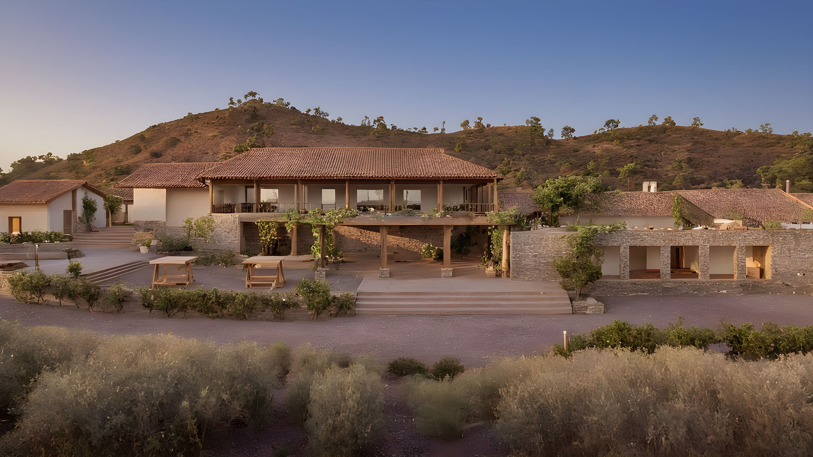 PromptThis is the evening view of a boutique winery placed amidst vast vineyards and dense vegetations. The walls are of cream lime plaster, roofs are clay tiles, plinth is of basalt and the structural members are of wood