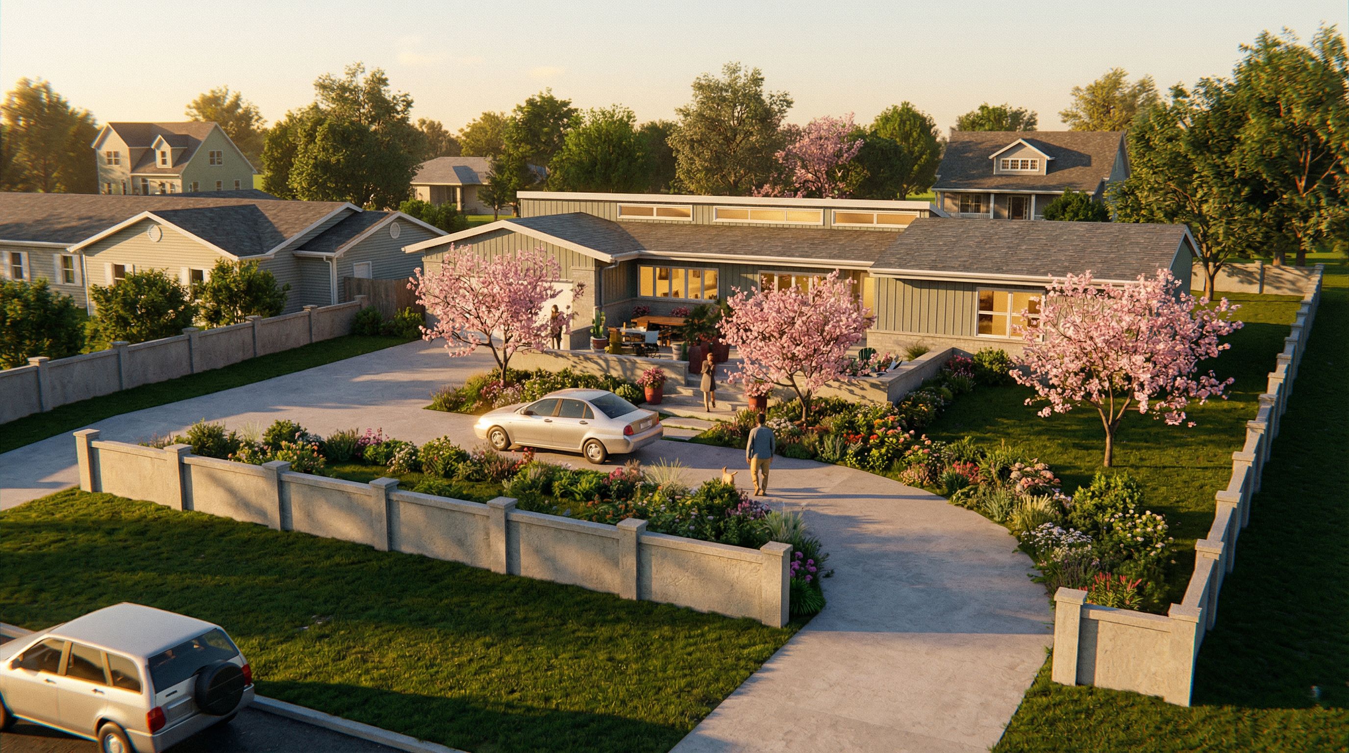 PromptPhoto of a modern single-family home nestled in a landscaped setting, showcasing a combination of horizontal gray green lap siding glass materials for a clean façade. The design features a spacious porch framed by vibrant cherry blossom trees and a neat garden, emphasizing outdoor living. Nearby houses create a suburban vibe. Bright daylight casts soft shadows, enhancing textures. Captured from a high angle with a 24mm lens to highlight the layout and surrounding greenery, inviting a sense of community and tranquility in the neighborhood., keep exact camera angle. Fence and patio are solid concrete., keep exact camera angle