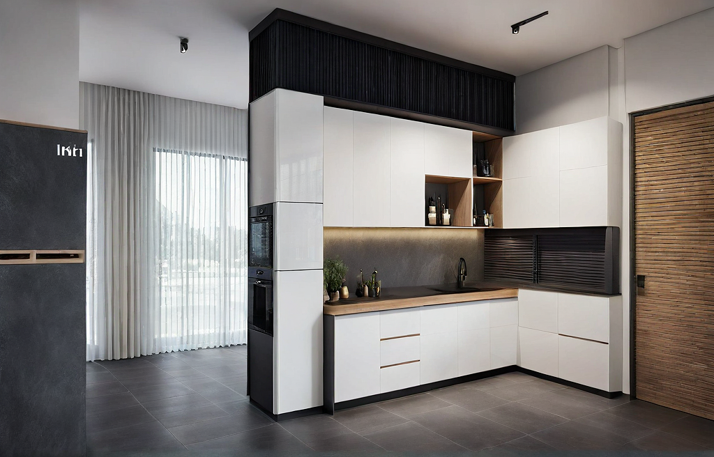 Promptmonochrome scandinavian kitchen cabinet, with white cabinet, dark grey cabinet panel on top of cabinet. black granite top table and wall. two side window with wood blind window. open shelf on side way cabinet. All white cabinet door. White ceramic floor tile