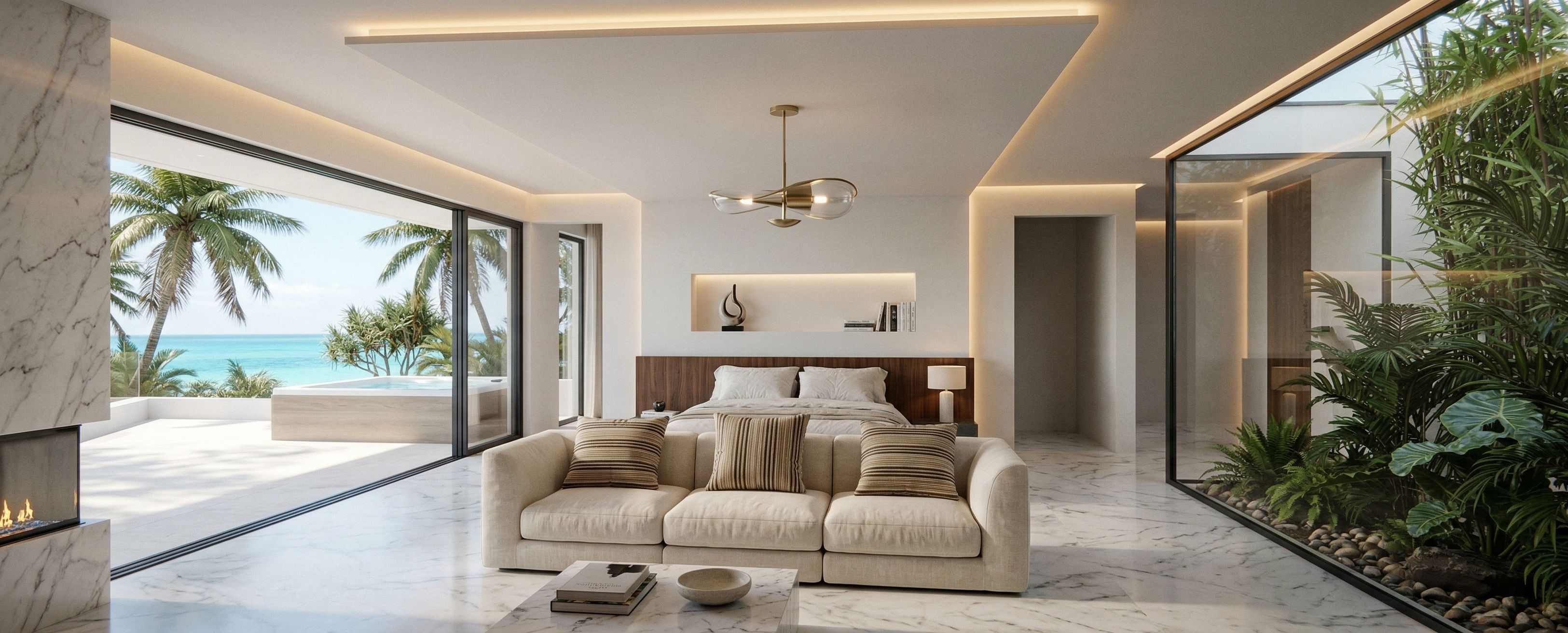 Photo of a modern bedroom suite featuring a stylish bed with fluffy pillows and a sleek sofa. The large glass walls invite natural light, highlighting the textures of soft fabrics and smooth wood finishes. The lush vegetation surrounding it adds an organic touch. Captured from a low angle to enhance spatial depth, with a wide-angle lens to encompass the open design and create cozy shadows, to the left there is an open terrace and a hot tub, the external landscape has a sea view framed by palm trees, the interior floor will be white marble, and the ceiling framed with perimeter indirect lighting.