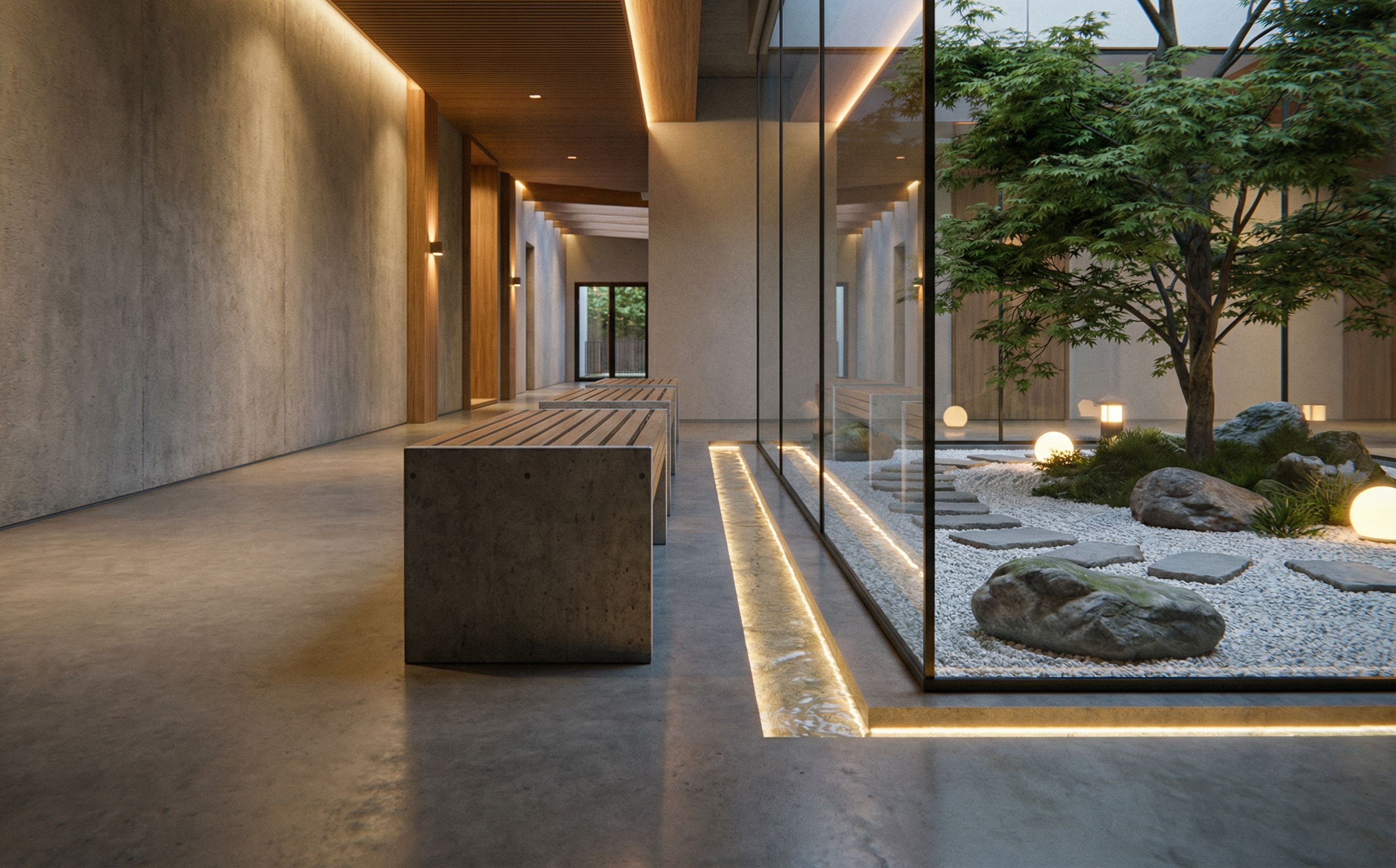 this is a corridor with central courtyard. make it zen courtyard, clean minimalist style yet calming n welcoming. there is a void around the tree as it punctures through the floor. theres lights around the tree/ around the courtyard. there is water rill around the rectangular courtyard. include lights in the water rill., keep exact camera angle