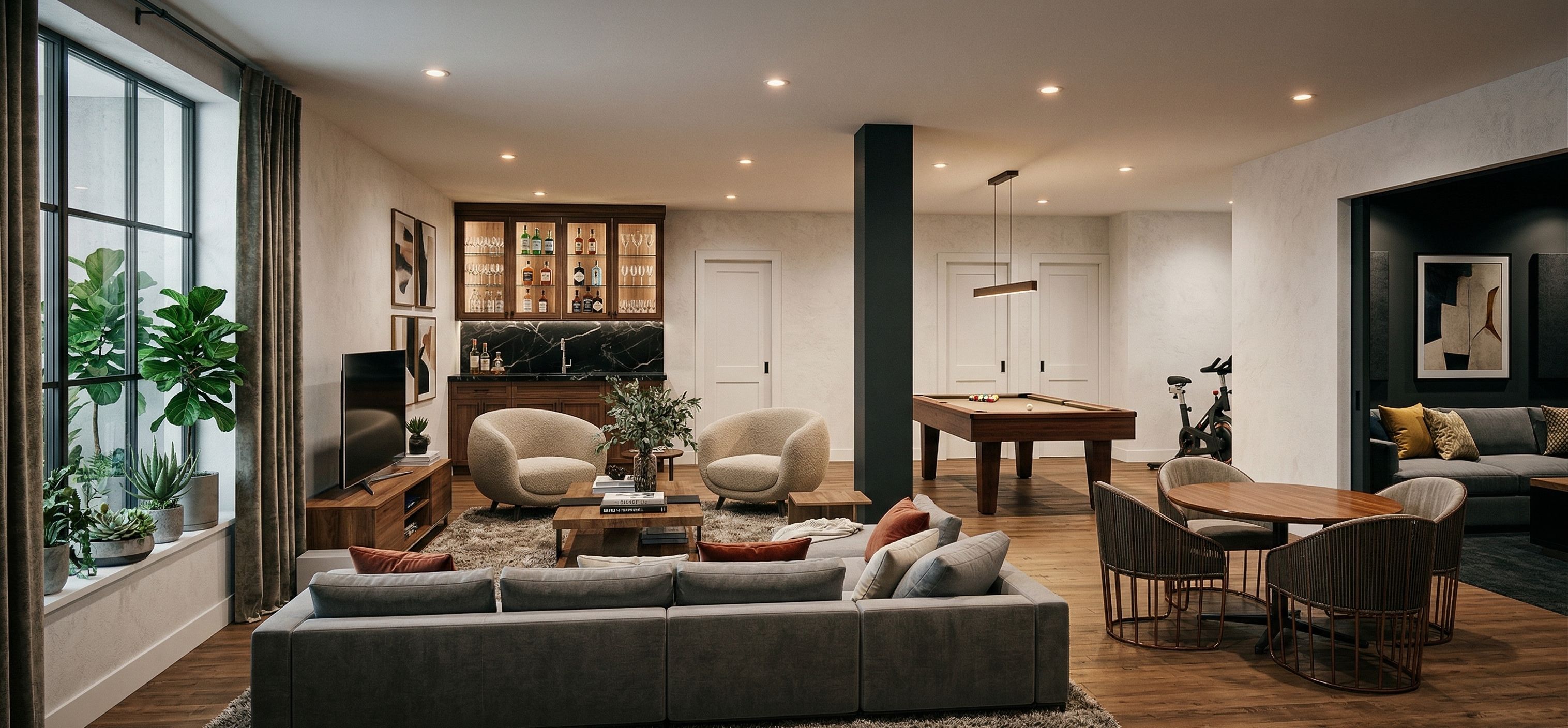 Prompta PHOTO OF A FUN REC ROOM, WARM BUT ELEGANT, MOODY THEATRE ROOM WITH WHITE POCKET DOORS TO THE RIGHT, EXCERSIZE AREA. SITTING AREA, WET BAR WITH GLASSES AND LIQOUR BOTTLES ON DISPLAY, COZY RUG AND CURTIANS, WALL ART THAT MATCHES THE ROOM, PLANTS, POT LIGHT IN CEILING, WINDOW ON THE LEFT, keep exact camera angle