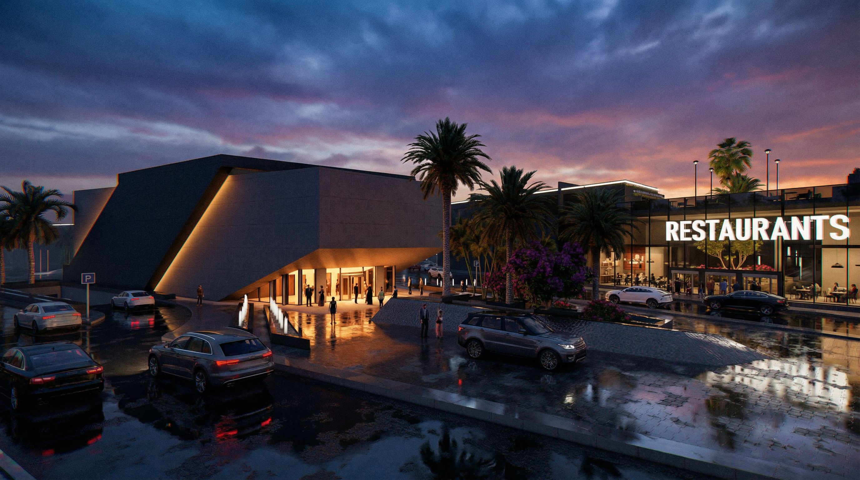 Promptthis a scene of an entrance of a theatre and an entrance for restaurant zone.. make things alive and real , keep exact camera angle