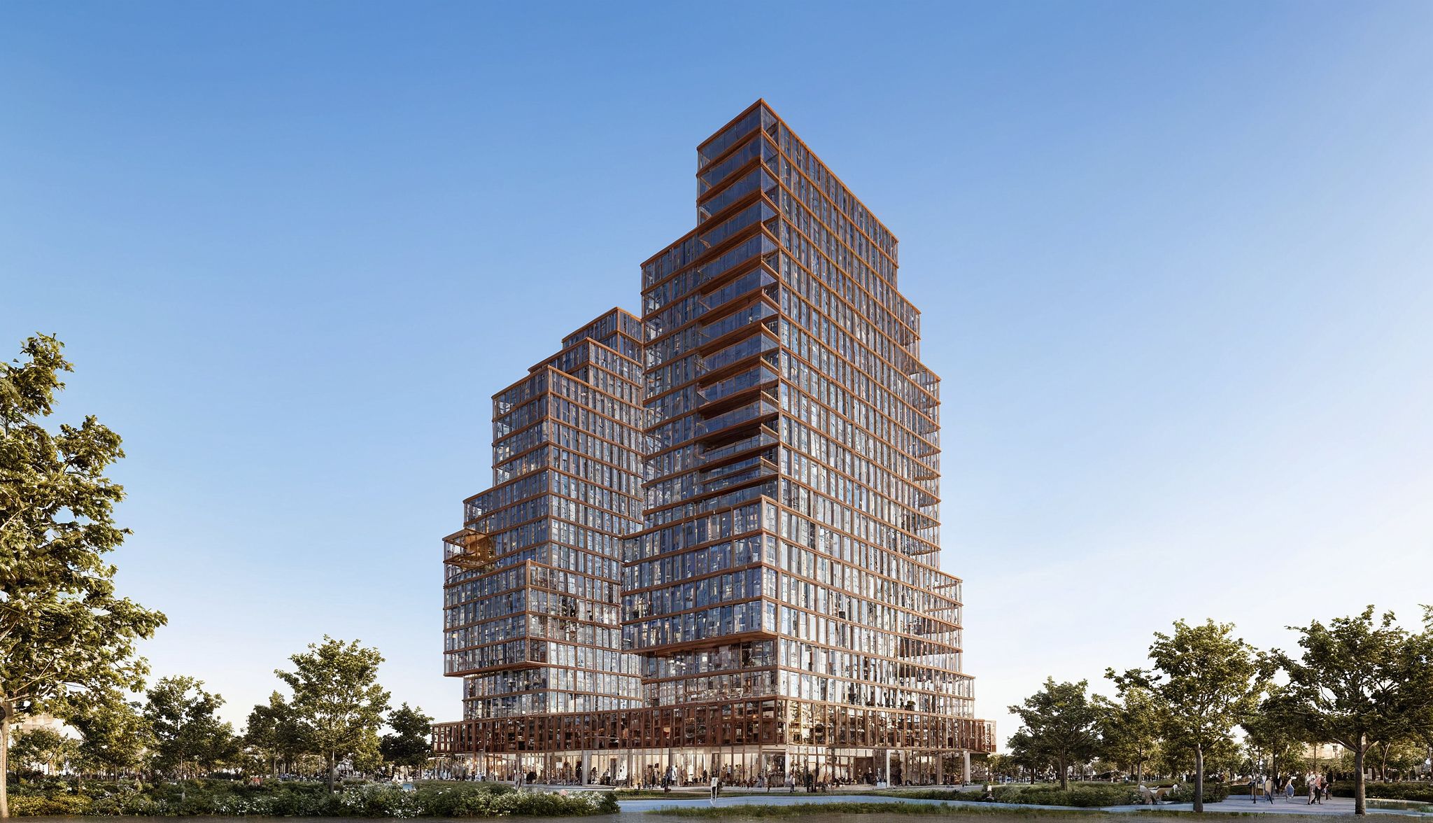 PromptUltra-realistic rendering of a contemporary mixed-use high-rise tower. The architecture is defined by a strong vertical grid façade in warm terracotta-colored frames, combined with floor-to-ceiling glass panels. The volumetry is staggered and dynamic, with blocks stacked and slightly shifted at different heights, creating visual movement. The tower rises slender and elegant, with smaller podium volumes stepping back. The ground floor is transparent and active with commercial functions, while the surrounding context includes green landscaped areas, trees, pedestrians, bicycles, and an urban street. Modern, photorealistic, refined architectural design.
