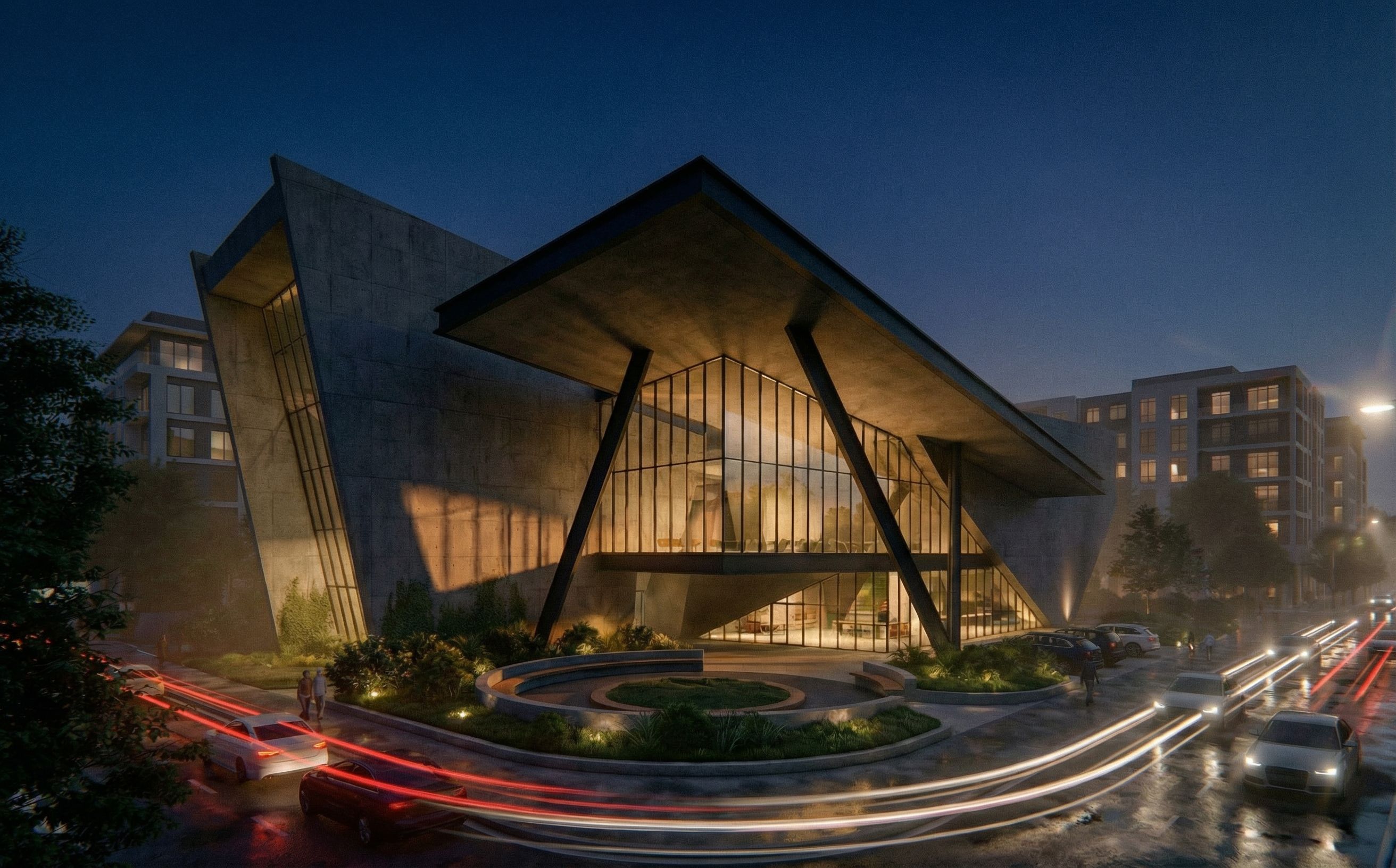 Photo of a contemporary architectural structure featuring dynamic angular forms and expansive glass facades. Surrounded by a lush urban setting, incorporating greenery and nearby modern buildings. The scene is illuminated by warm afternoon sunlight, casting deep shadows that accentuate the structure’s unique textures of steel and concrete. Captured from a low-angle perspective with a wide-angle lens, emphasizing the height and grandeur of the design while providing a dramatic view of the surrounding landscape. Long exposure car streaks, keep exact camera angle
