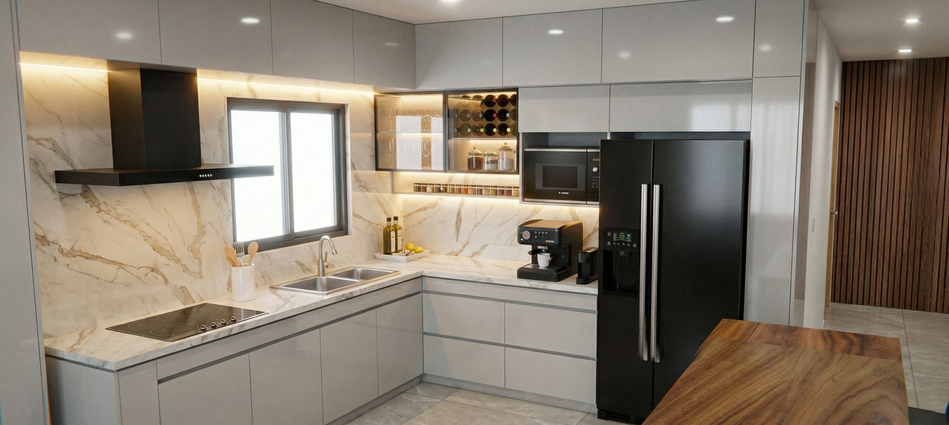 PromptCALACATA COUNTERTOP AND BACKSPLASH, STRAIGHTEN HIGH CABINET BESIDE REF, WOOD BAR COUNTER, UNDER CABINET LIGHTING, LIGHT GREY GLOSSY DOOR CABINET, SREIGHTEN REFRIGERATOR, GLASS CABINET DOOR FOR WINE AND JARS , keep exact camera angle