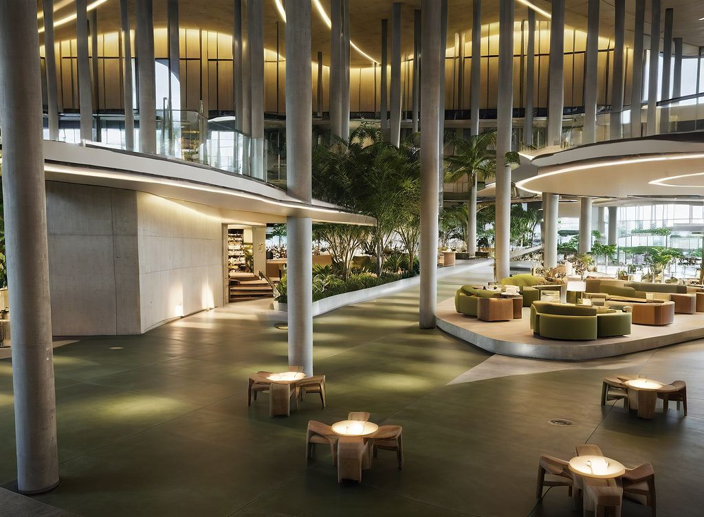 modern airport lounge, seating area, duty free, shops, landscape garden, two levels building, organic ceilings, concrete columns, soft whites 60% olive greens 30% soft yellows 10% color palette, natural daylight, realistic results, high quality materials, daytime sky mode.