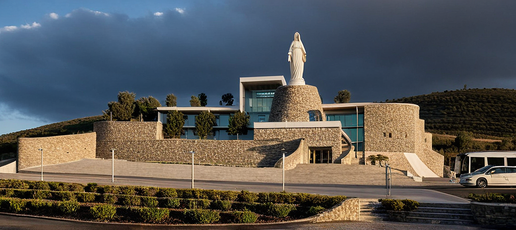 important 12 meter Hight mother Mary sculpture on top of a circular building with stairs around it ,sunset ,olive fields on the side of the hills, add a lot of tourists and nuns to the render, old stone cladding ' cars on the road ,dim warm lights from inside the buildings, bus station near the street , don't change the building geometry and shape, parking on right side
